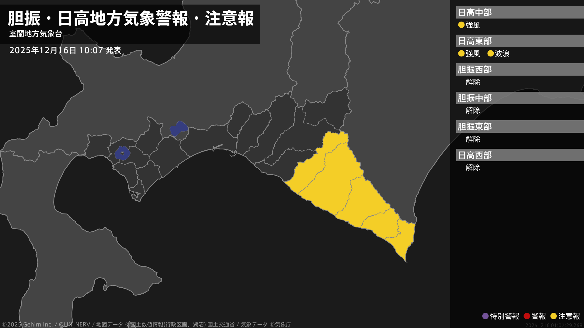 【胆振・日高地方 気象警報・注意報 2025年12月16日 10:07】日高地方では、強風や高波に注意してください。#気象警報注意報 #胆振地方 #日高地方