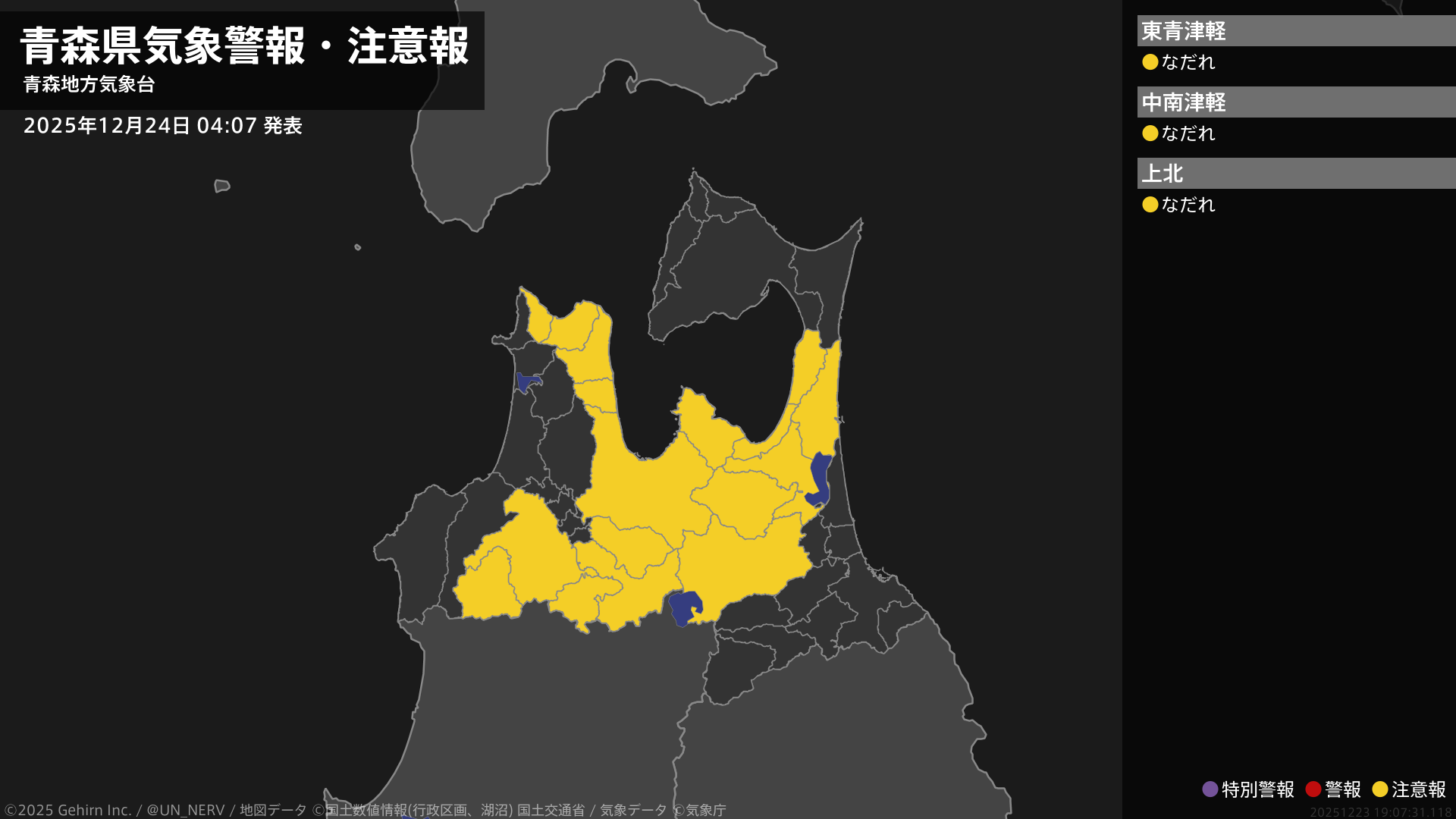 【青森県 気象警報・注意報 2025年12月24日 04:07】