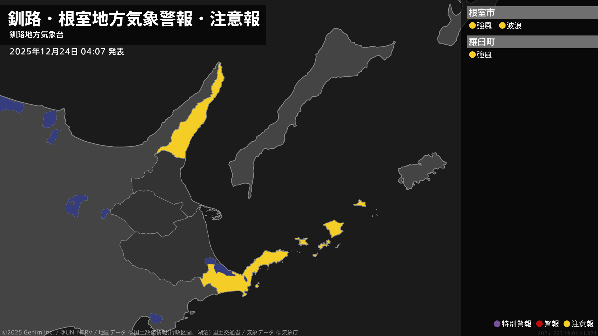 【釧路・根室地方 気象警報・注意報 2025年12月24日 04:07】