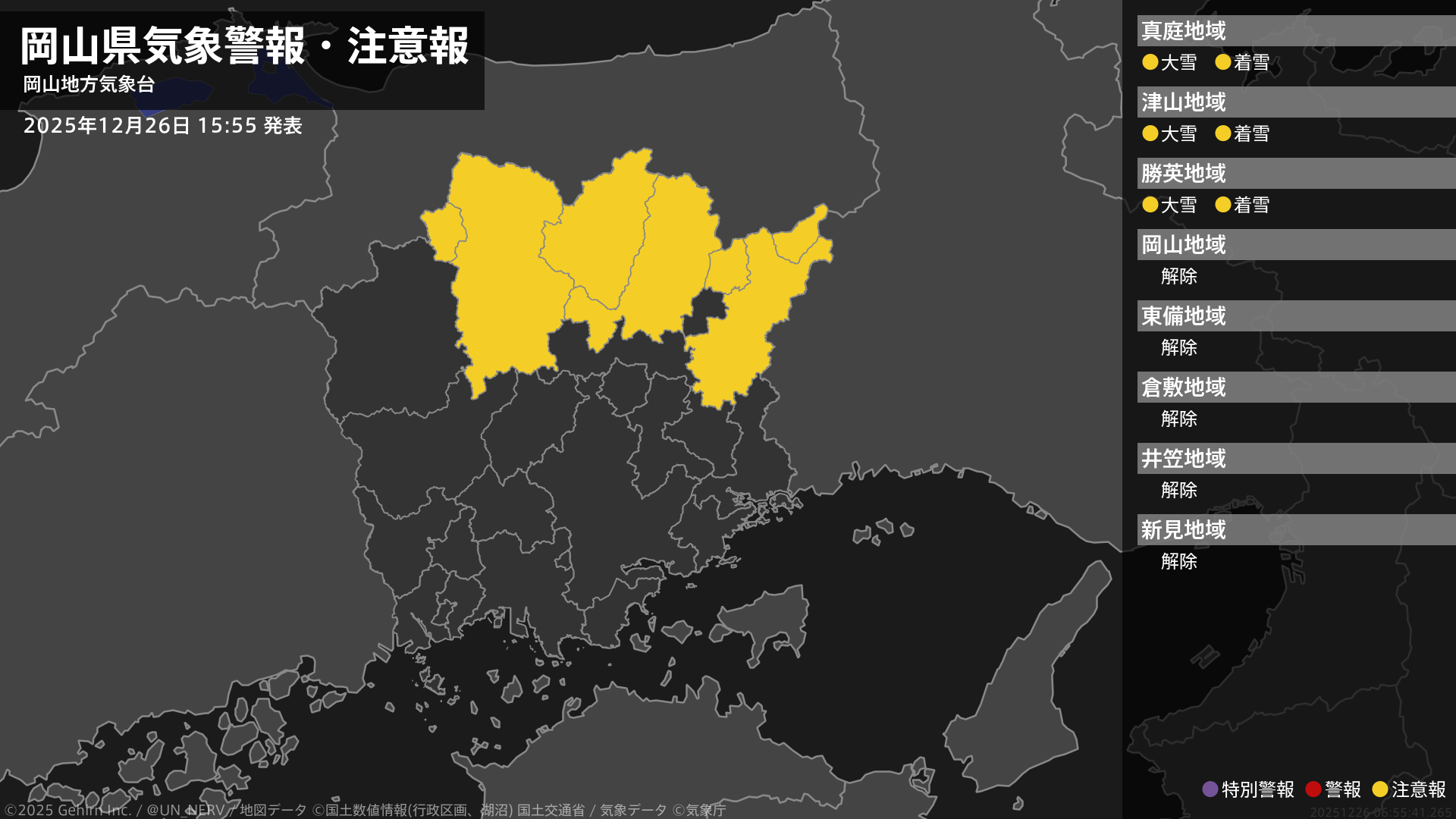 【岡山県 気象警報・注意報 2025年12月26日 15:55】北部では、26日夜のはじめ頃まで大雪や電線等への着雪に注意してください。#気象警報注意報 #岡山県