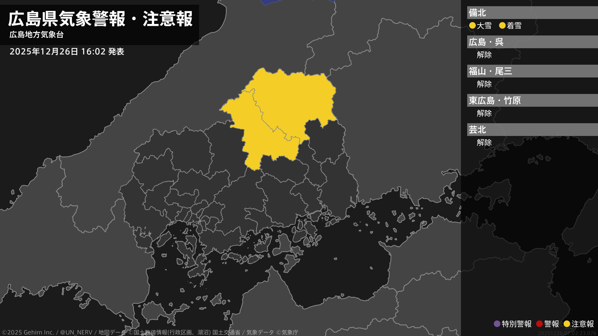 【広島県 気象警報・注意報 2025年12月26日 16:02】北部では、26日夜のはじめ頃まで大雪や電線等への着雪に注意してください。#気象警報注意報 #広島県