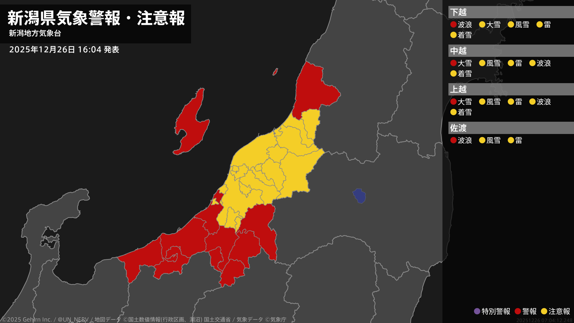 【新潟県 気象警報・注意報 2025年12月26日 16:04】中越、上越では、26日夜遅くまで大雪に警戒してください。下越、佐渡では、27日未明まで高波に警戒してください。#気象警報注意報 #新潟県