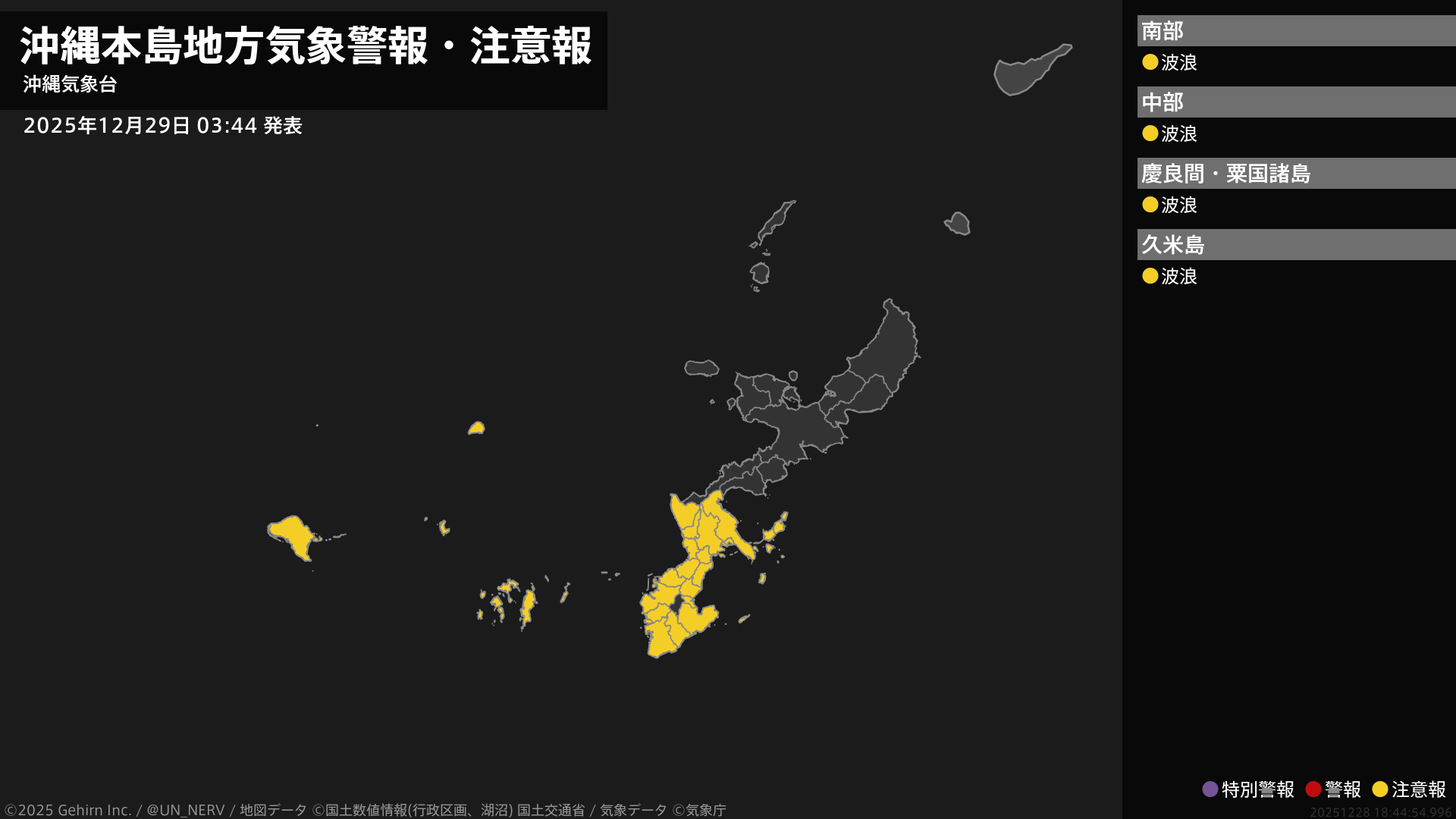 【沖縄本島地方 気象警報・注意報 2025年12月29日 03:44】本島中南部、久米島では、29日昼前から高波に注意してください。#気象警報注意報 #沖縄本島地方
