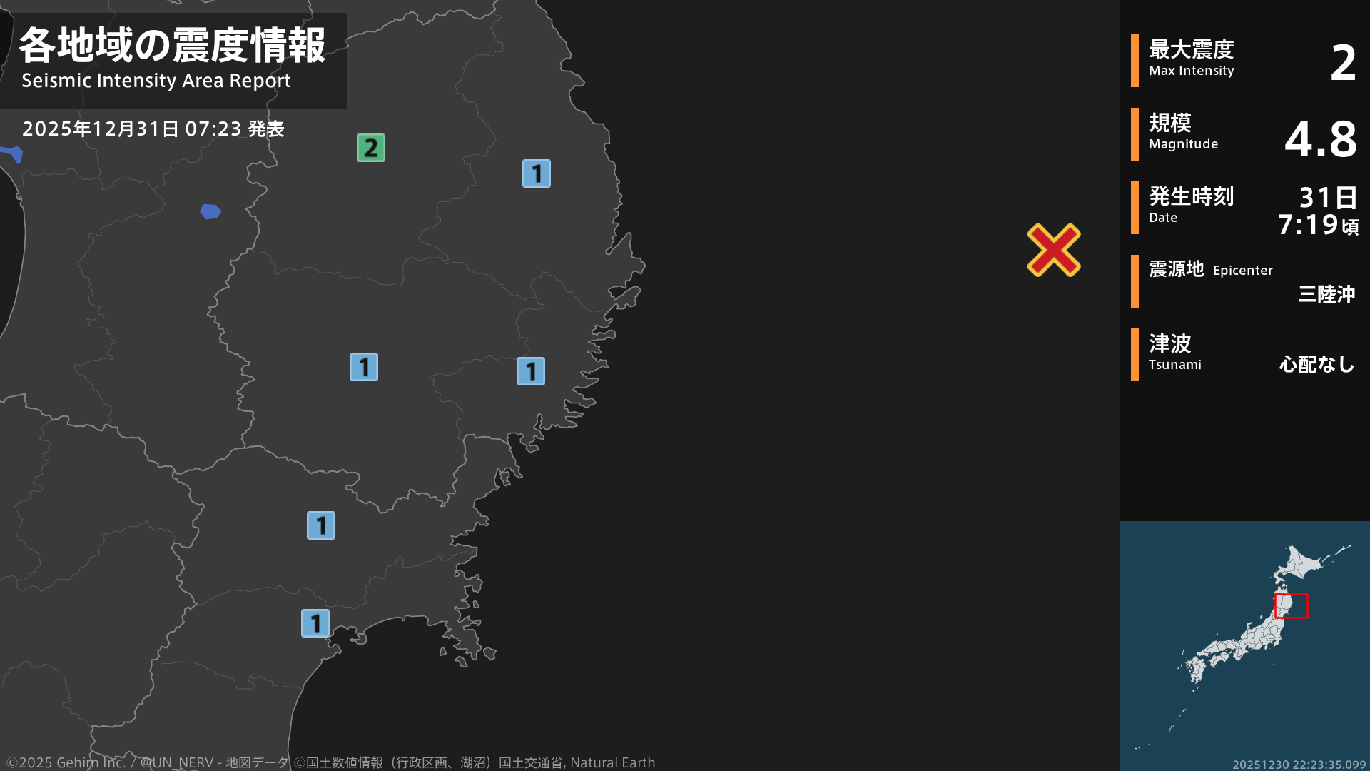 7時19分頃、三陸沖を震源とする地震がありました。震源の深さは約30km、地震の規模はM4.9程度、最大震度2程度と推定されています。詳しい情報が入り次第お伝えします。