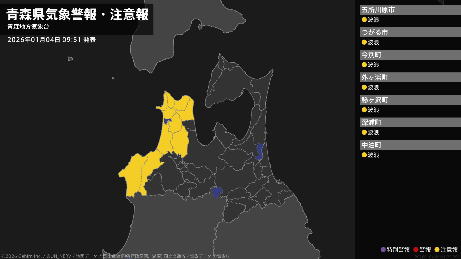 【青森県 気象警報・注意報 2026年01月04日 09:51】津軽では、高波に注意してください。#気象警報注意報 #青森県