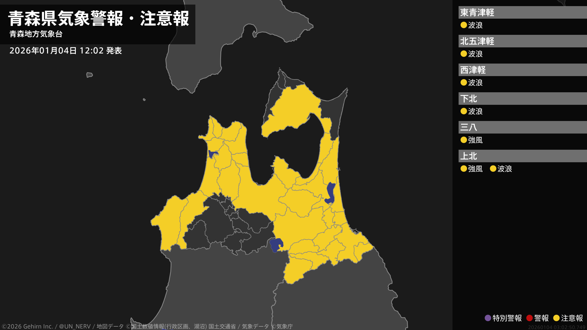 【青森県 気象警報・注意報 2026年01月04日 12:02】三八上北では、強風に注意してください。青森県では、高波に注意してください。#気象警報注意報 #青森県