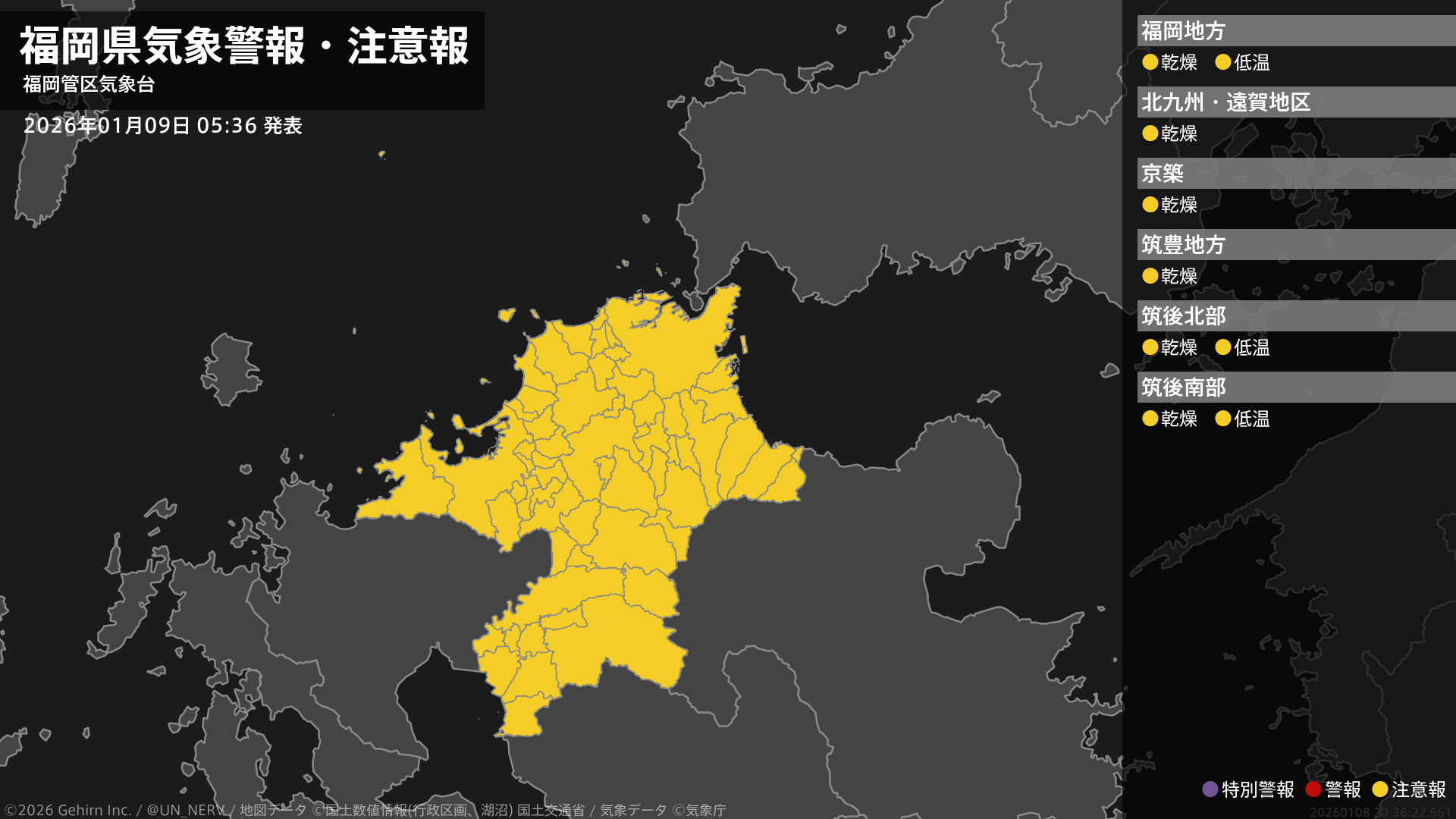 【福岡県 気象警報・注意報 2026年01月09日 05:36】福岡県では、10日まで空気の乾燥した状態が続くため、火の取り扱いに注意してください。福岡、筑後地方では、9日まで低温に注意してください。#気象警報注意報 #福岡県