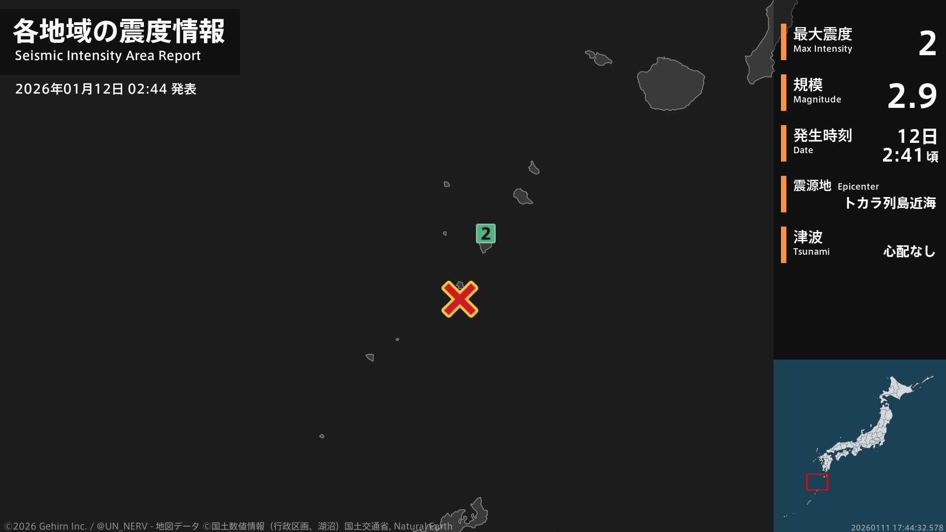 【地震情報 2026年1月12日】2時41分頃、トカラ列島近海を震源とする地震がありました。震源の深さはごく浅い、地震の規模はM2.9、最大震度2を鹿児島県で観測しています。この地震による津波の心配はありません。#地震 #鹿児島県