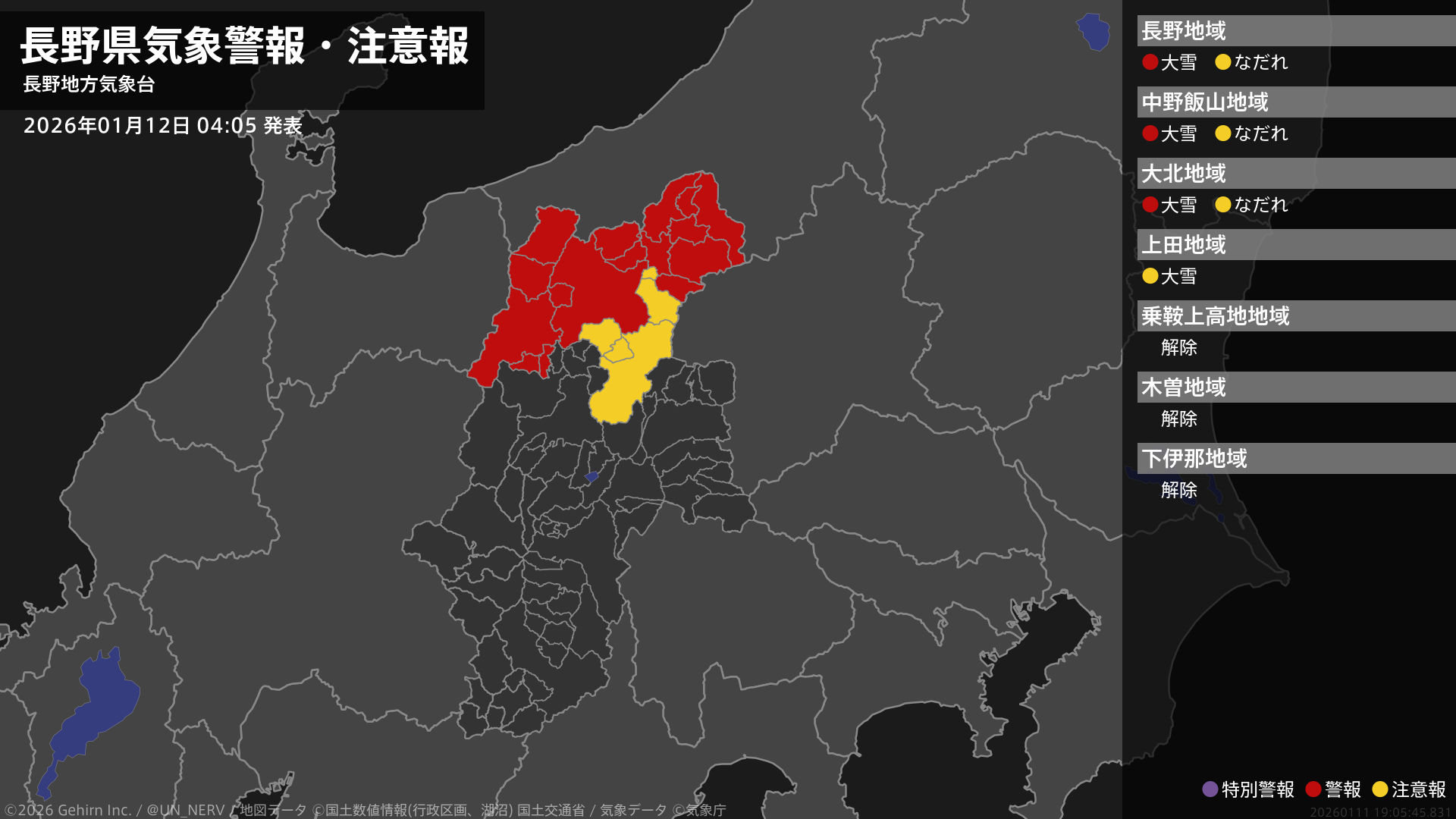 【長野県 気象警報・注意報 2026年01月12日 04:05】北部では、12日明け方まで大雪に警戒してください。#気象警報注意報 #長野県