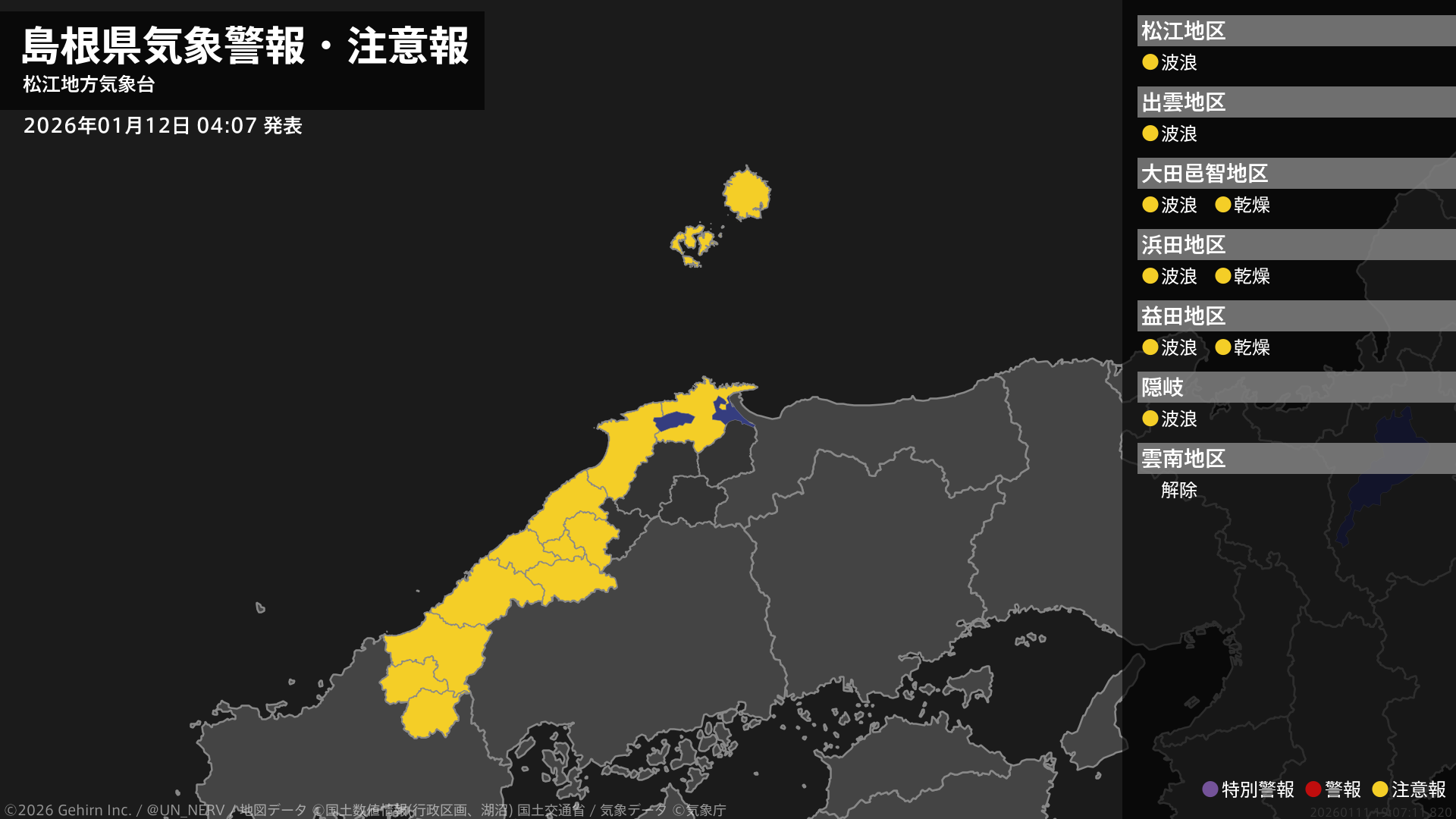 【島根県 気象警報・注意報 2026年01月12日 04:07】島根県では、高波に注意してください。西部では、空気の乾燥した状態が続くため、火の取り扱いに注意してください。#気象警報注意報 #島根県