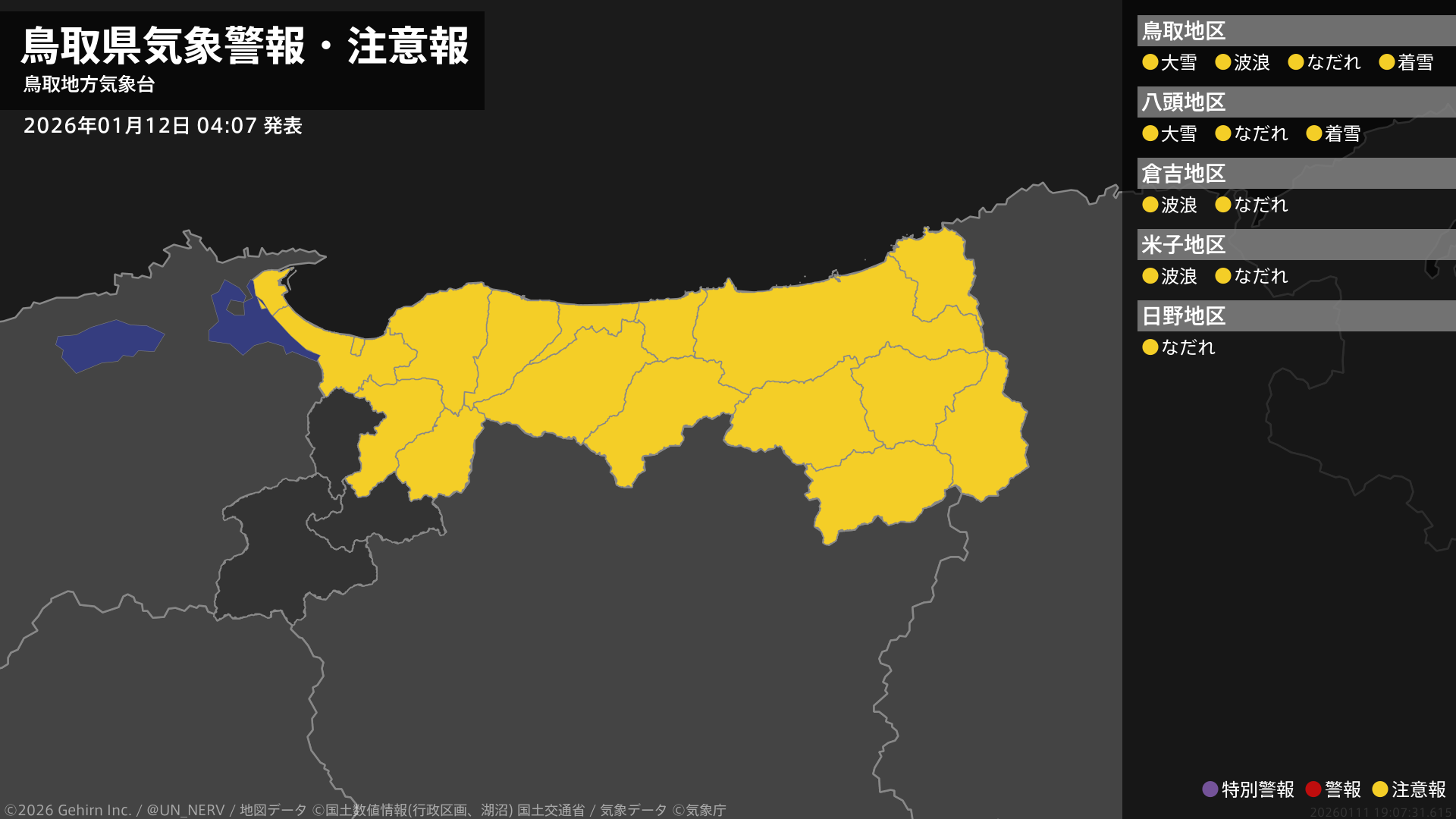 【鳥取県 気象警報・注意報 2026年01月12日 04:07】東部では、大雪や電線等への着雪に注意してください。鳥取県では、高波やなだれに注意してください。#気象警報注意報 #鳥取県