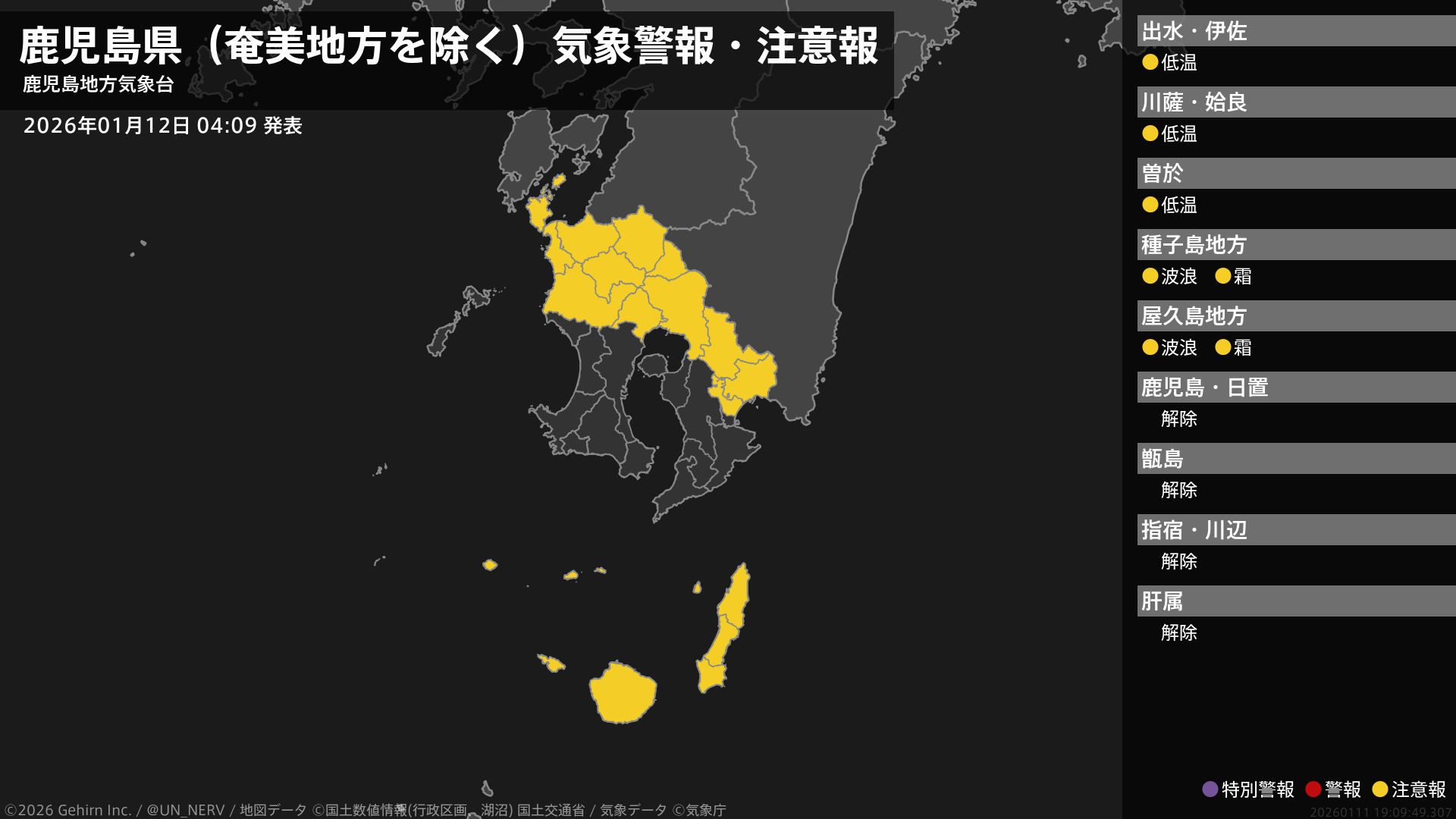 【鹿児島県(奄美地方を除く) 気象警報・注意報 2026年01月12日 04:09】種子島・屋久島地方では、12日昼前まで高波に、12日朝は霜に対する農作物の管理に注意してください。薩摩、大隅地方では、12日まで低温に注意してください。#気象警報注意報 #鹿児島県(奄美地方除く)