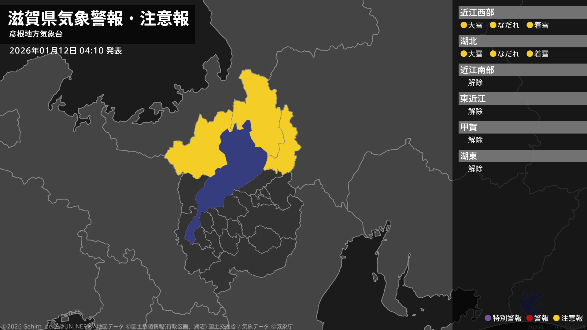 【滋賀県 気象警報・注意報 2026年01月12日 04:10】北部では、12日昼前まで大雪や電線等への着雪に、13日までなだれに注意してください。#気象警報注意報 #滋賀県