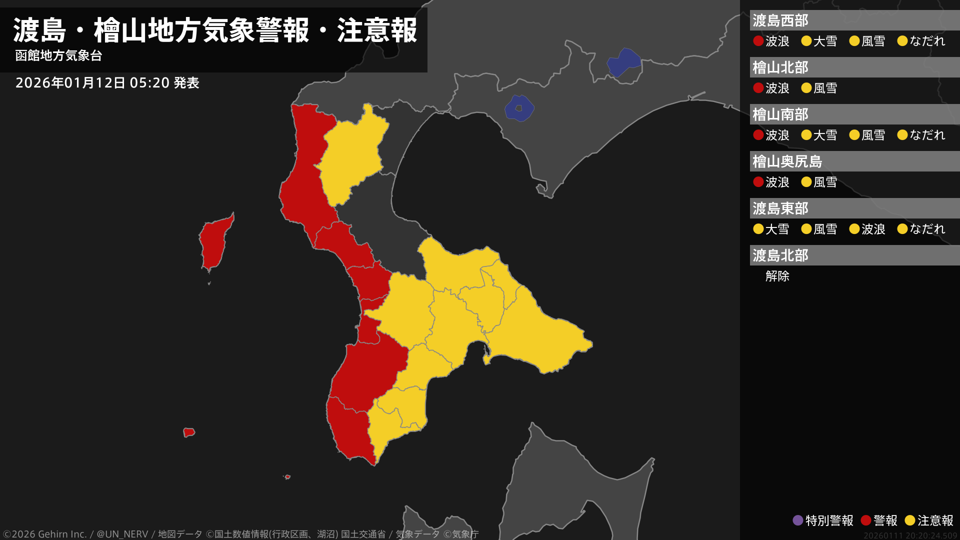 【渡島・檜山地方 気象警報・注意報 2026年01月12日 05:20】渡島、檜山地方では、12日昼過ぎまで高波に警戒してください。#気象警報注意報 #渡島地方 #檜山地方