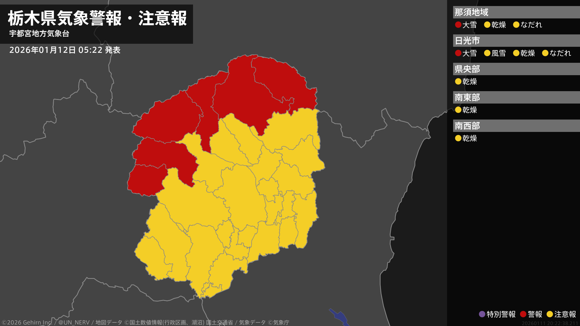 【栃木県 気象警報・注意報 2026年01月12日 05:22】北部では、12日朝まで大雪に警戒してください。#気象警報注意報 #栃木県