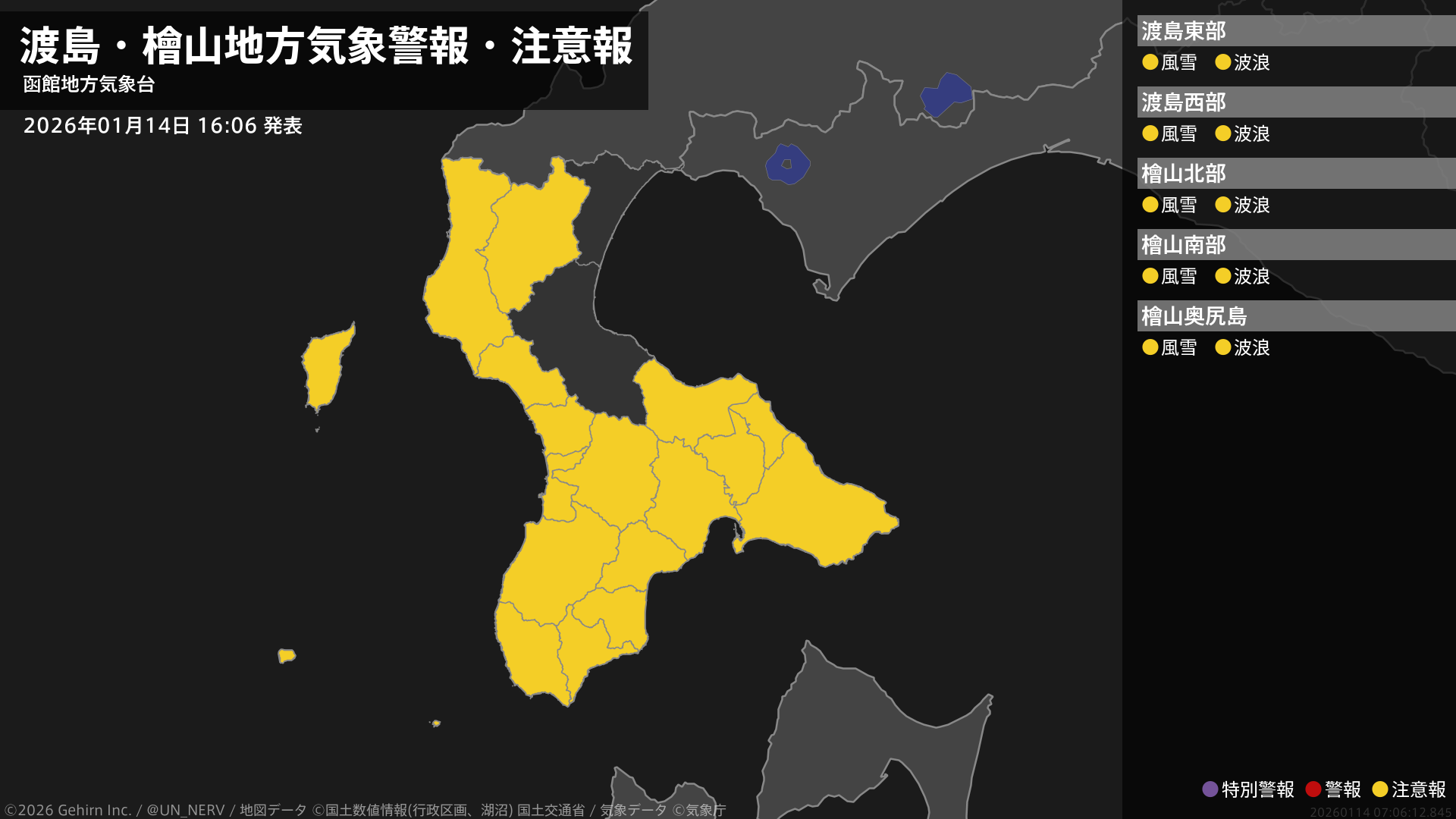 【渡島・檜山地方 気象警報・注意報 2026年01月14日 16:06】渡島、檜山地方では、15日昼前まで風雪や高波に注意してください。#気象警報注意報 #渡島地方 #檜山地方