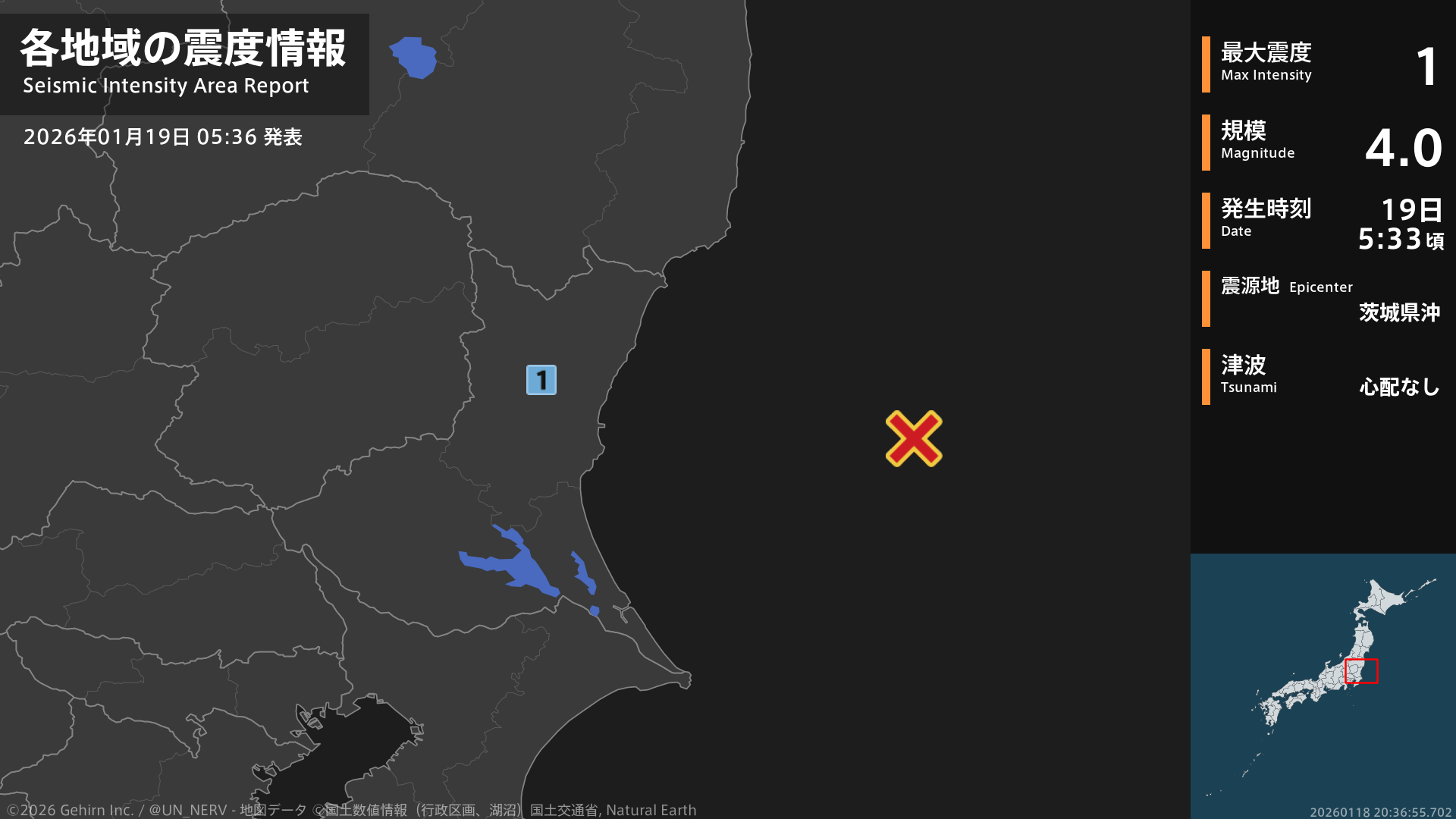5時33分頃、茨城県沖を震源とする地震がありました。震源の深さは約30km、地震の規模はM4.0、最大震度1を茨城県で観測しています。この地震による津波の心配はありません。