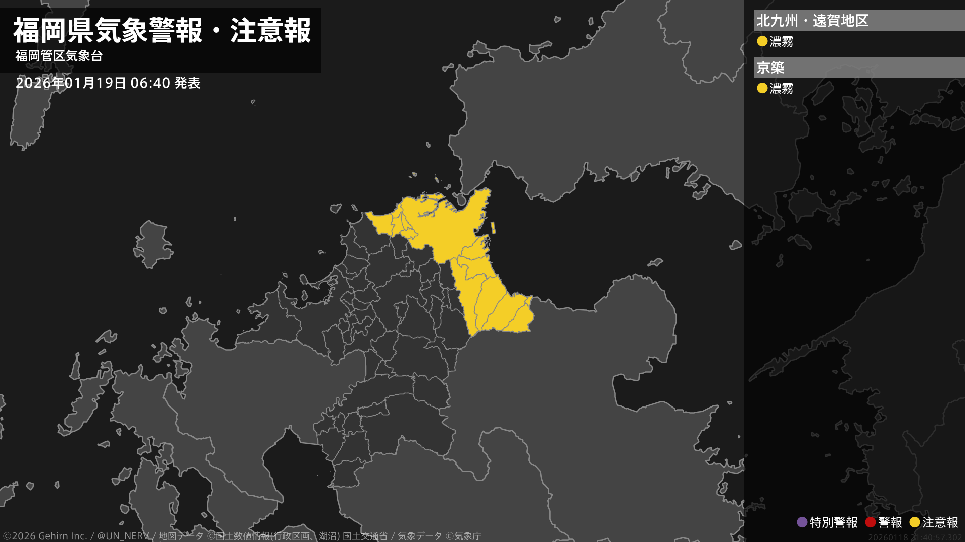 【福岡県 気象警報・注意報 2026年01月19日 06:40】