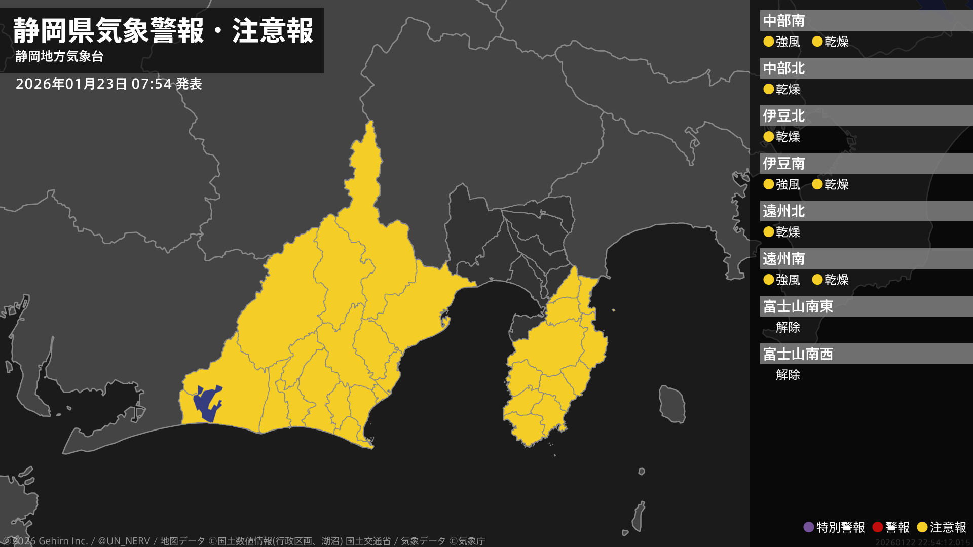 【静岡県 気象警報・注意報 2026年01月23日 07:54】中部、伊豆、西部では、強風と、空気の乾燥した状態が続くため火の取り扱いに注意してください。#気象警報注意報 #静岡県