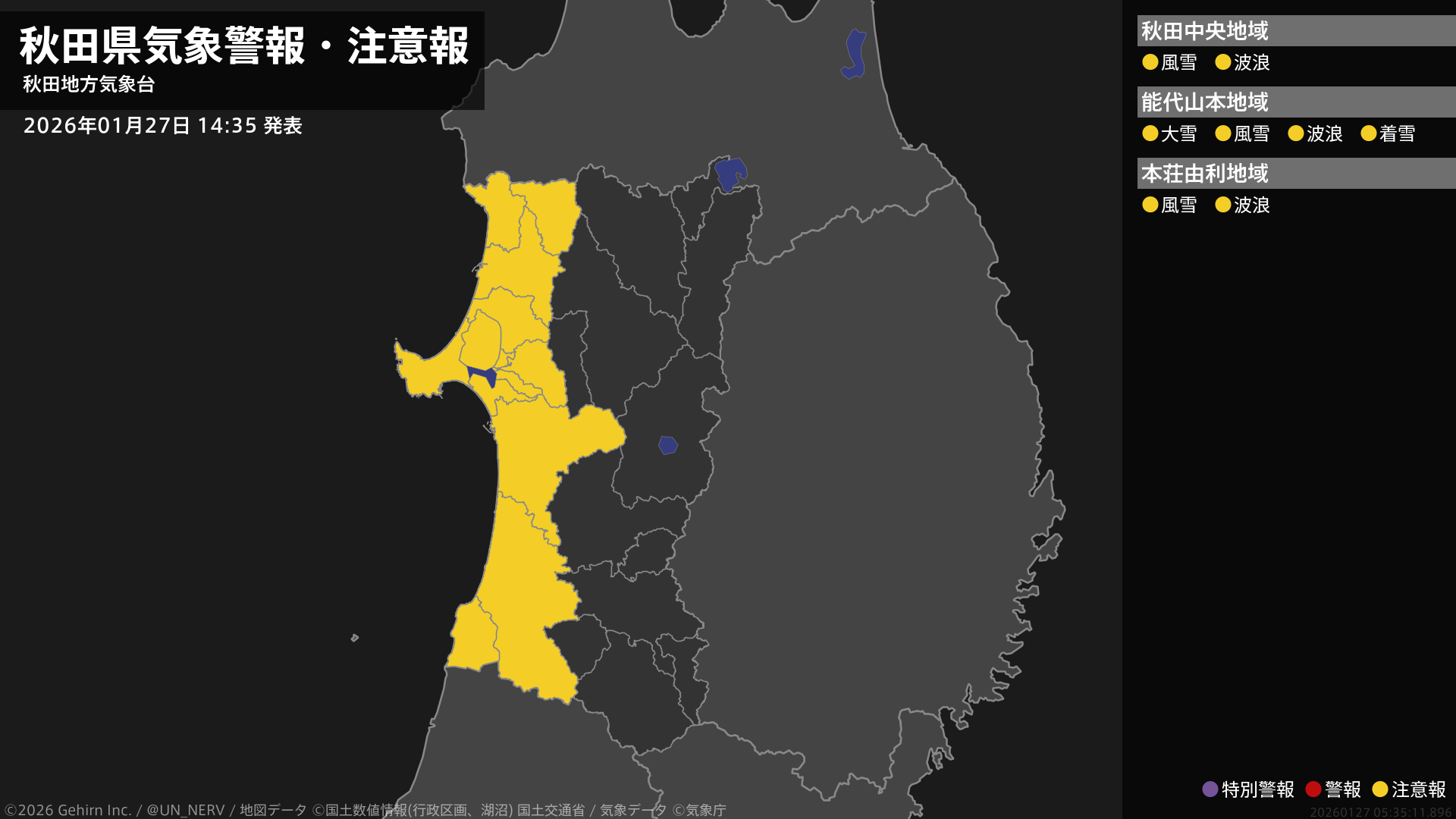 【秋田県 気象警報・注意報 2026年01月27日 14:35】沿岸では、28日明け方まで風雪や大雪、電線等への着雪に、27日夕方から高波に注意してください。#気象警報注意報 #秋田県