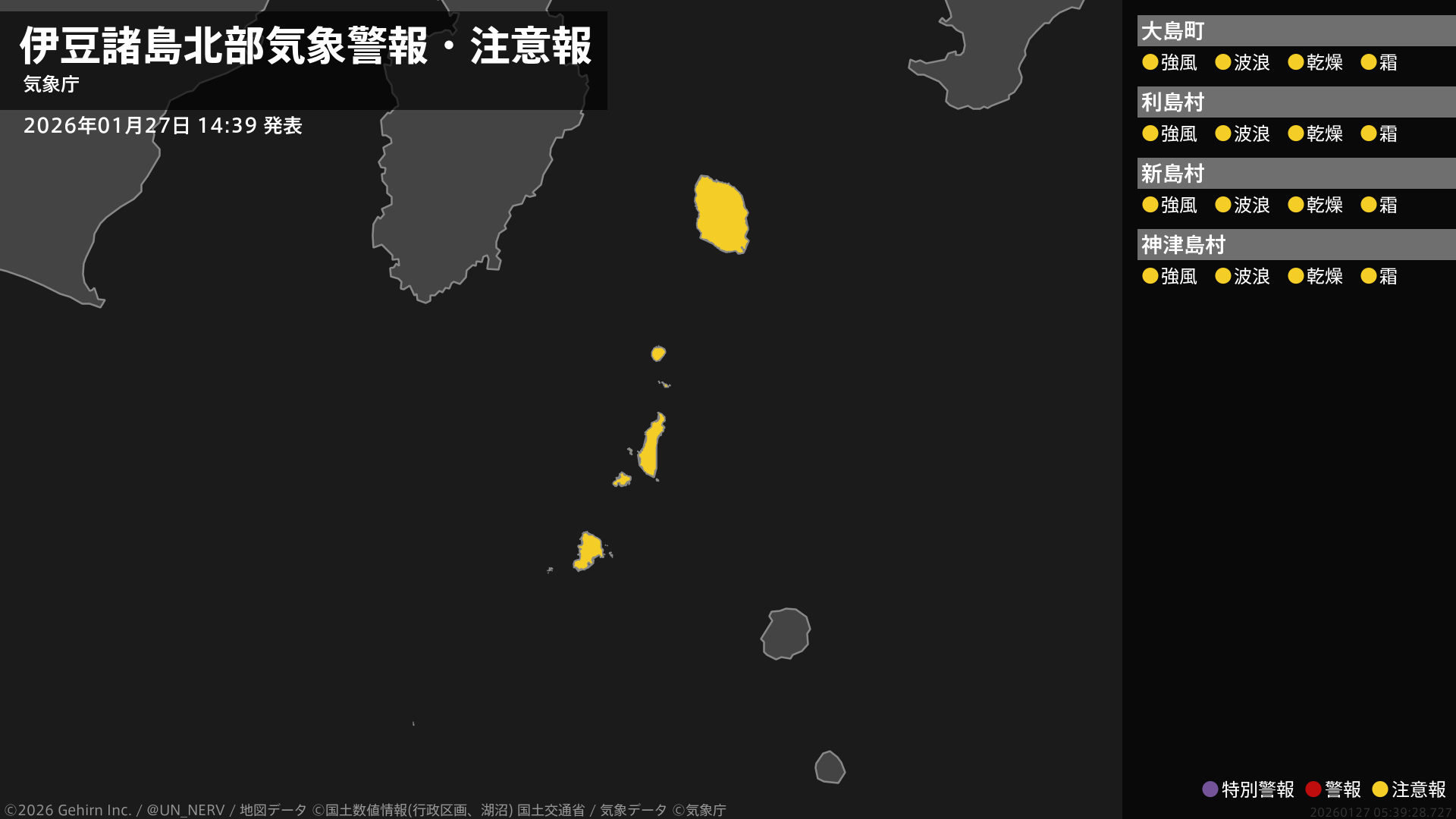 【東京都 気象警報・注意報 2026年01月27日 14:39】東京地方、伊豆諸島北部、伊豆諸島南部では、強風や高波、空気の乾燥した状態が続くため、火の取り扱い、霜に対する農作物の管理に注意してください。#気象警報注意報 #東京都