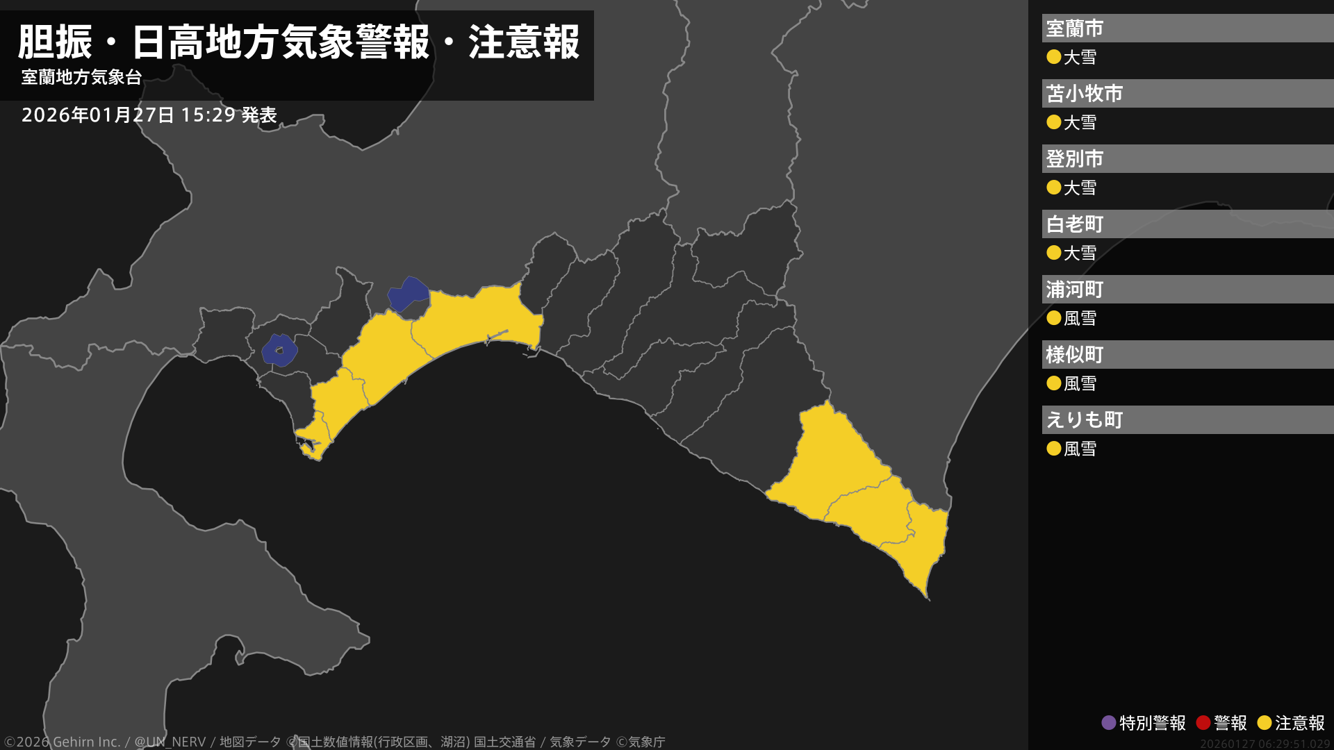 【胆振・日高地方 気象警報・注意報 2026年01月27日 15:29】日高地方では、27日夜遅くから28日明け方まで風雪に注意してください。胆振地方では、27日夜のはじめ頃から28日明け方まで大雪に注意してください。#気象警報注意報 #胆振地方 #日高地方