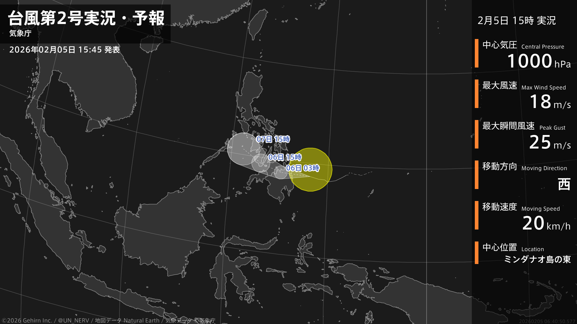 【台風第2号実況・予報 2026年02月05日 15:40】台風第2号(ペンニャ)は、ミンダナオ島の東を1時間に20キロの速さで西に進んでいます。#台風情報