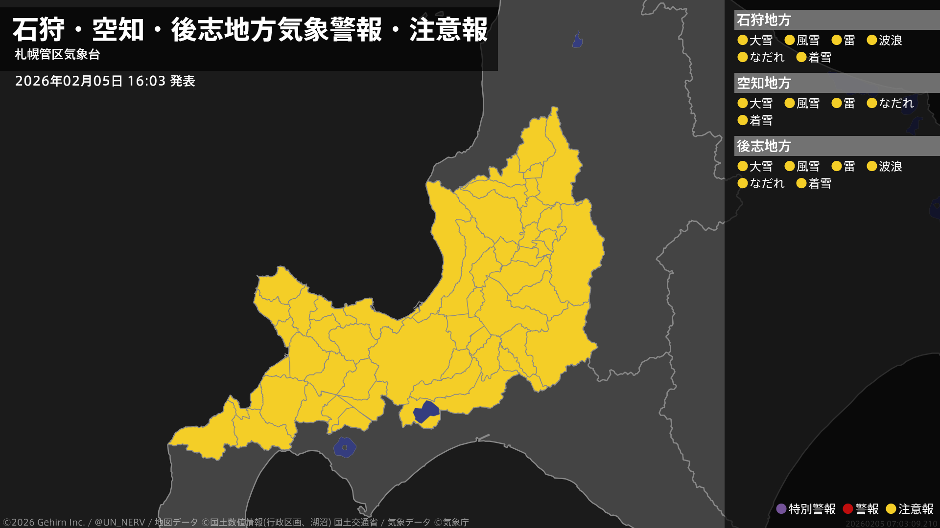 【石狩・空知・後志地方 気象警報・注意報 2026年02月05日 16:03】石狩、空知、後志地方では、風雪や大雪、竜巻などの激しい突風、落雷、なだれ、電線等への着雪に注意してください。石狩、後志地方では、高波に注意してください。#気象警報注意報 #石狩地方 #空知地方 #後志地方