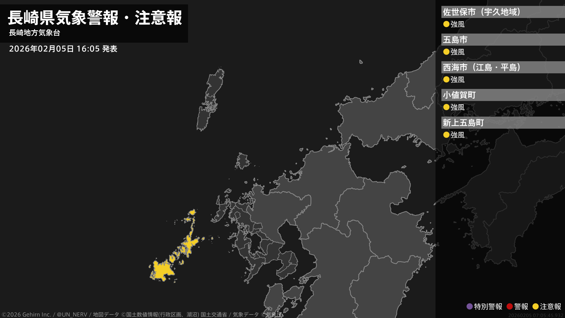 【長崎県 気象警報・注意報 2026年02月05日 16:05】五島では、6日明け方から強風に注意してください。#気象警報注意報 #長崎県