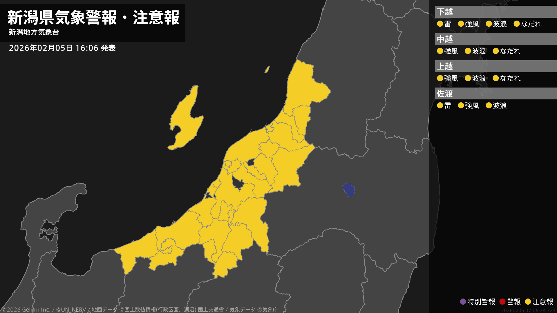 【新潟県 気象警報・注意報 2026年02月05日 16:06】新潟県では、強風や高波に注意してください。下越、佐渡では、落雷に注意してください。下越、中越、上越では、なだれに注意してください。#気象警報注意報 #新潟県
