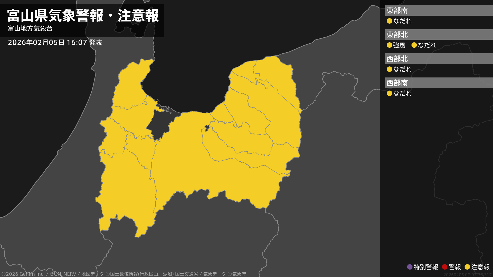 【富山県 気象警報・注意報 2026年02月05日 16:07】