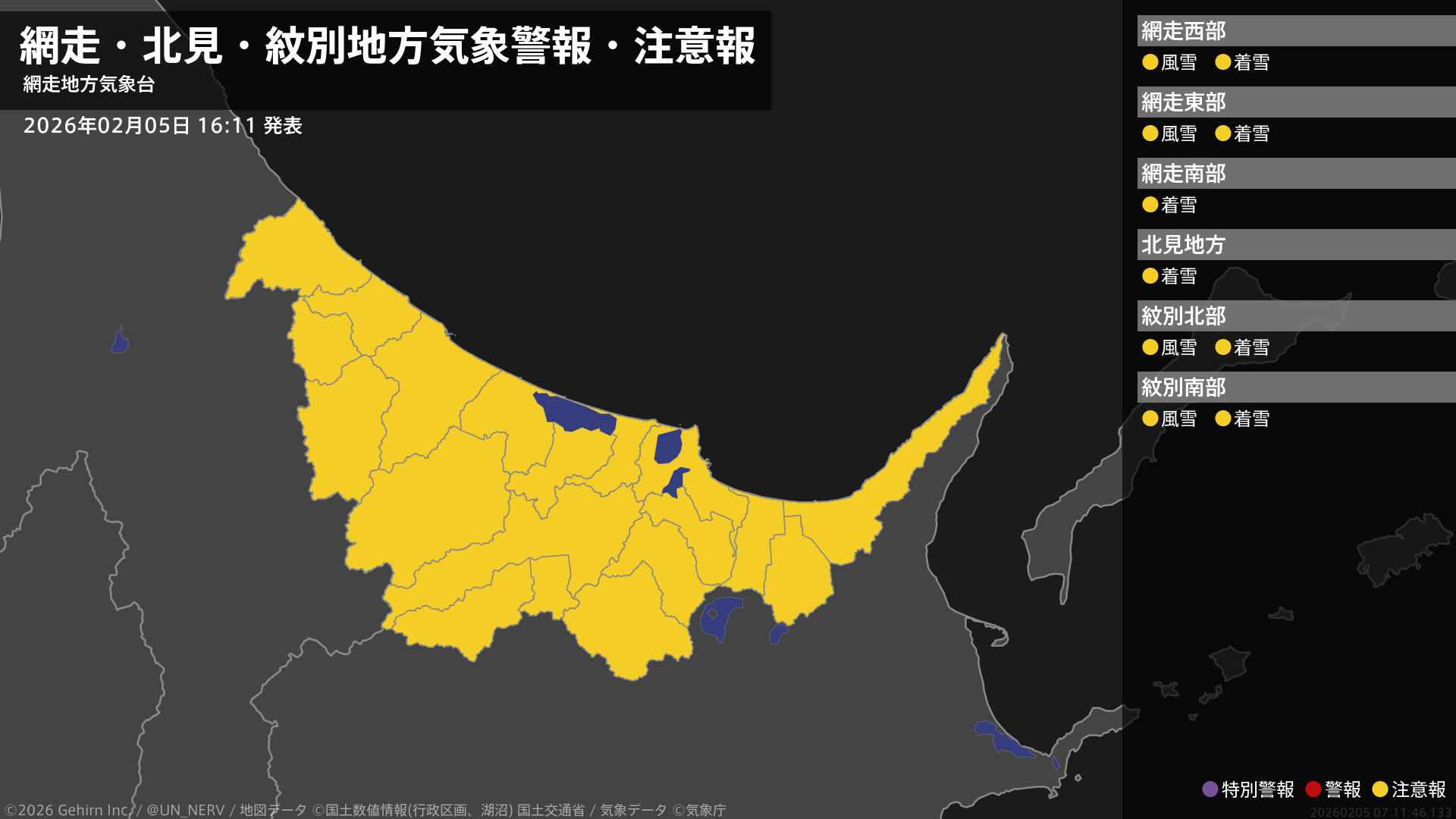 【網走・北見・紋別地方 気象警報・注意報 2026年02月05日 16:11】