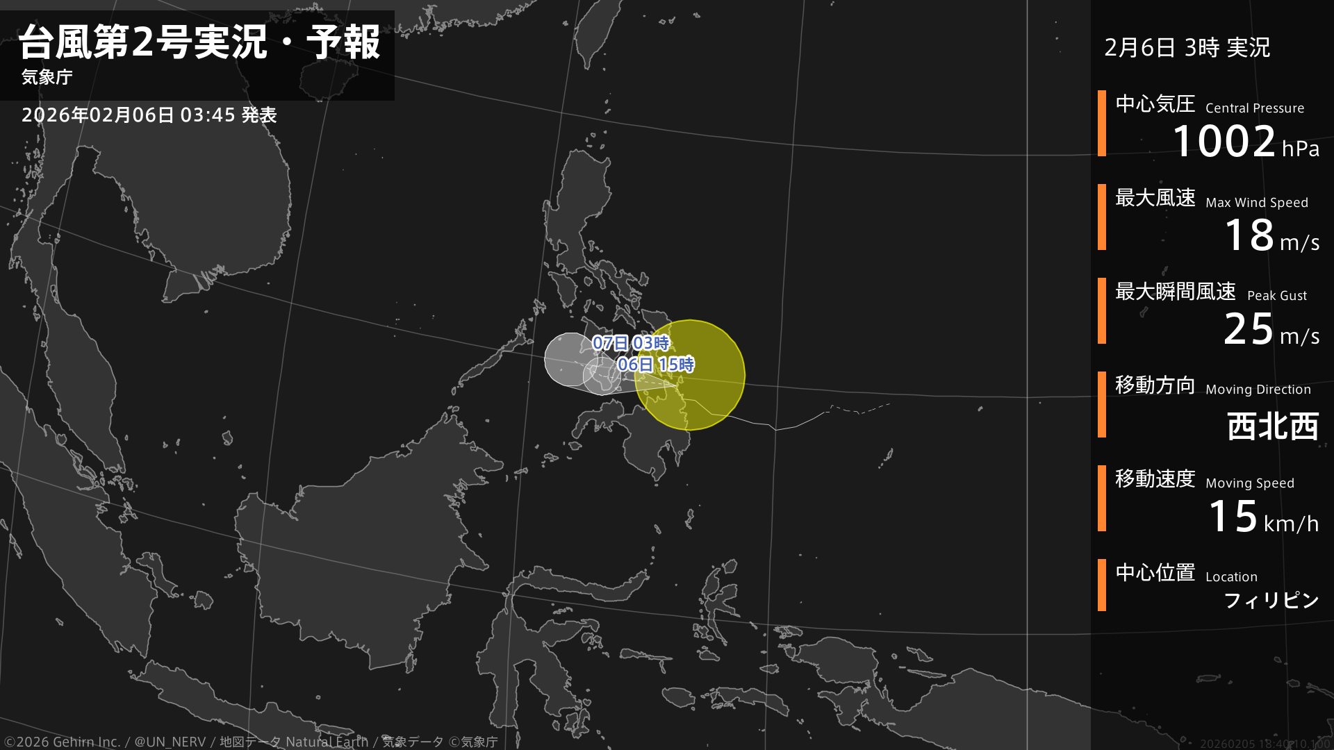 【台風第2号実況・予報 2026年02月06日 03:40】台風第2号(ペンニャ)は、フィリピンを1時間に15キロの速さで西北西に進んでいます。#台風情報