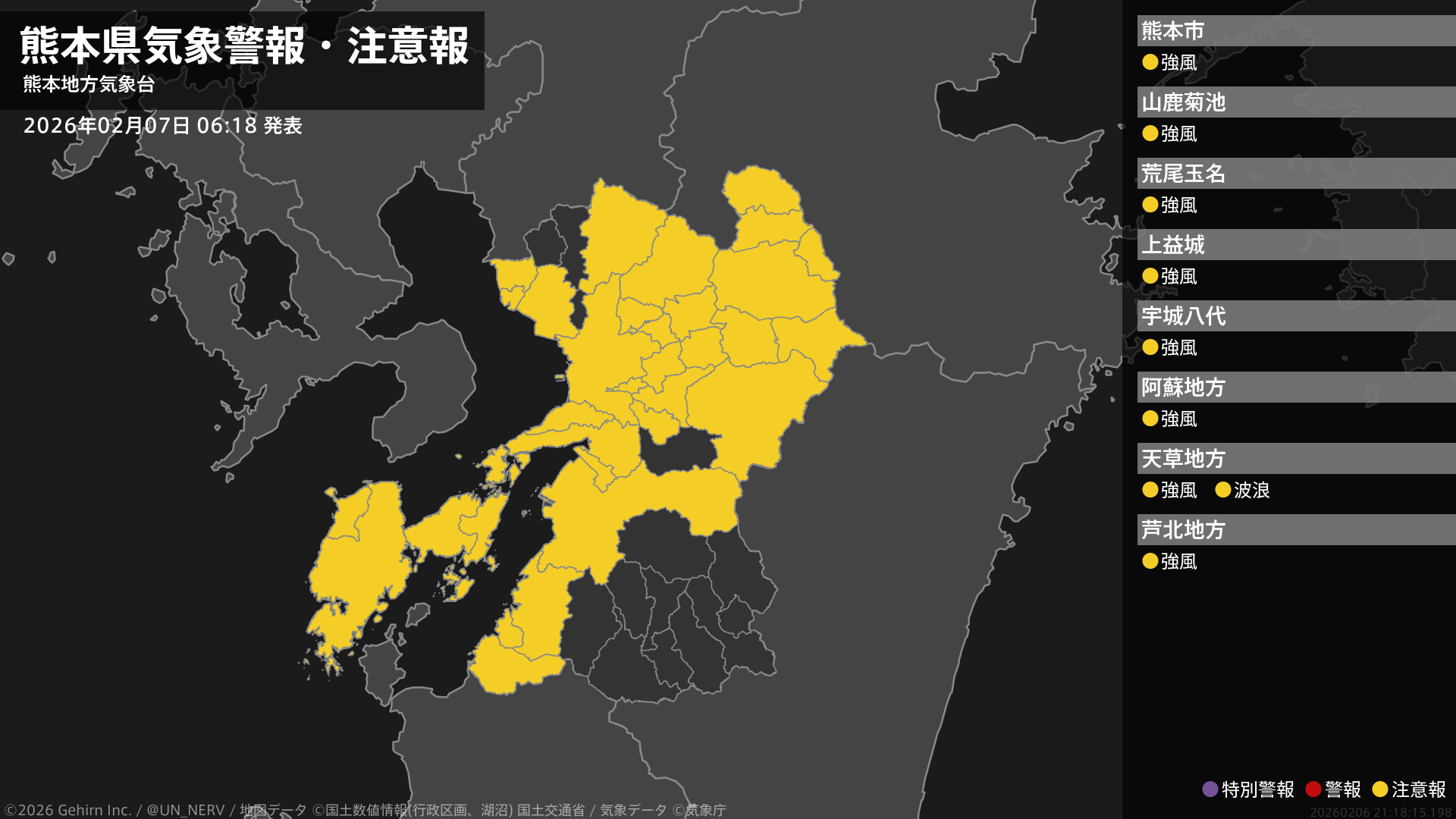 【熊本県 気象警報・注意報 2026年02月07日 06:18】
