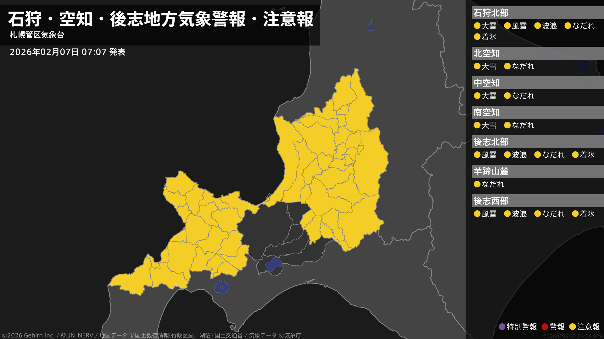 【石狩・空知・後志地方 気象警報・注意報 2026年02月07日 07:07】