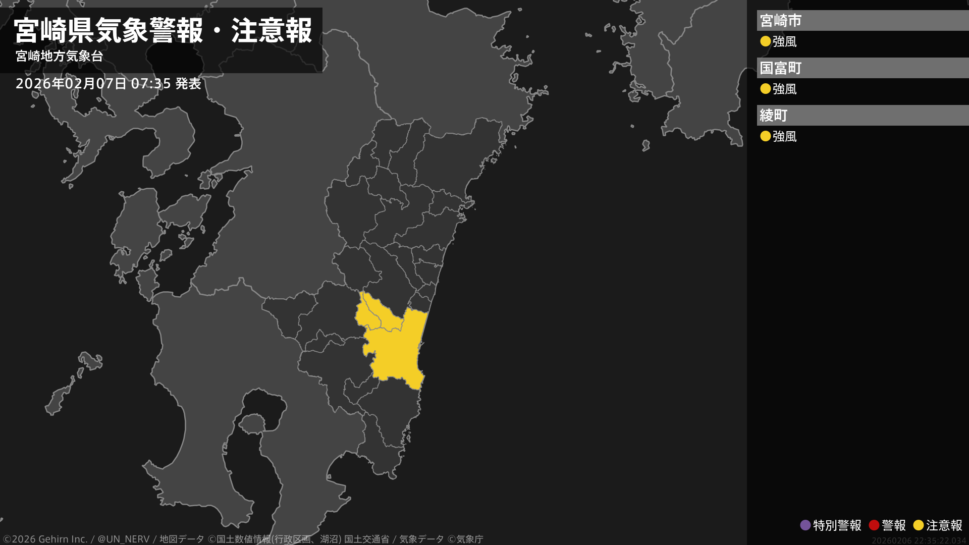 【宮崎県 気象警報・注意報 2026年02月07日 07:35】