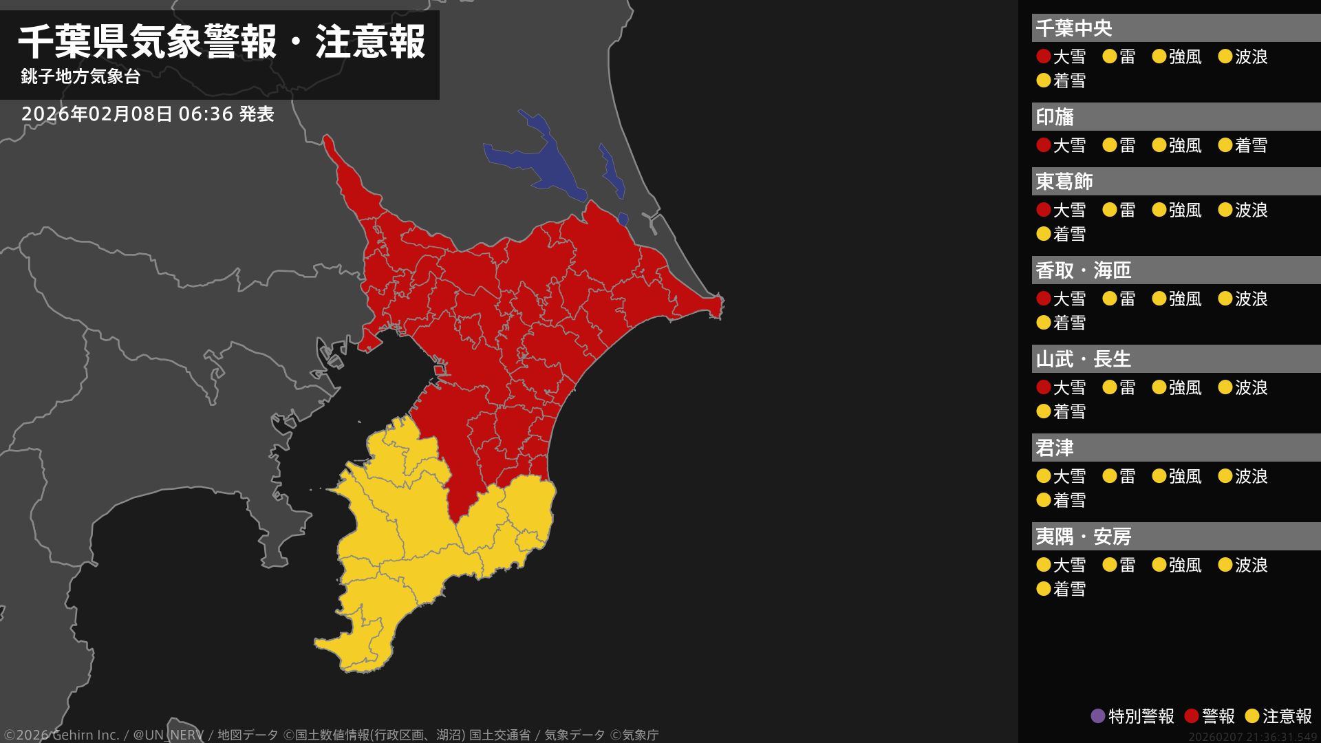 【千葉県 気象警報・注意報 2026年02月08日 06:36】北西部、北東部では、8日昼前まで大雪に警戒してください。#気象警報注意報 #千葉県