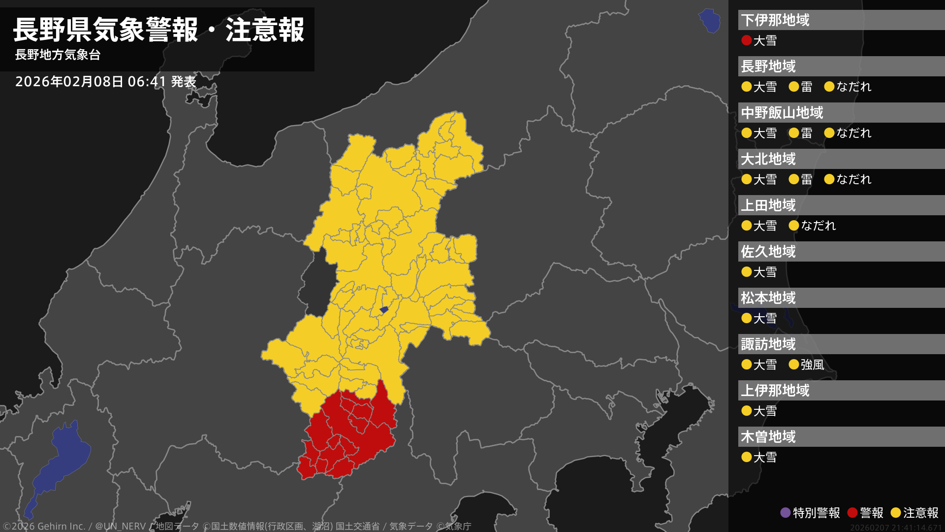 【長野県 気象警報・注意報 2026年02月08日 06:41】南部では、8日昼前まで大雪に警戒してください。#気象警報注意報 #長野県