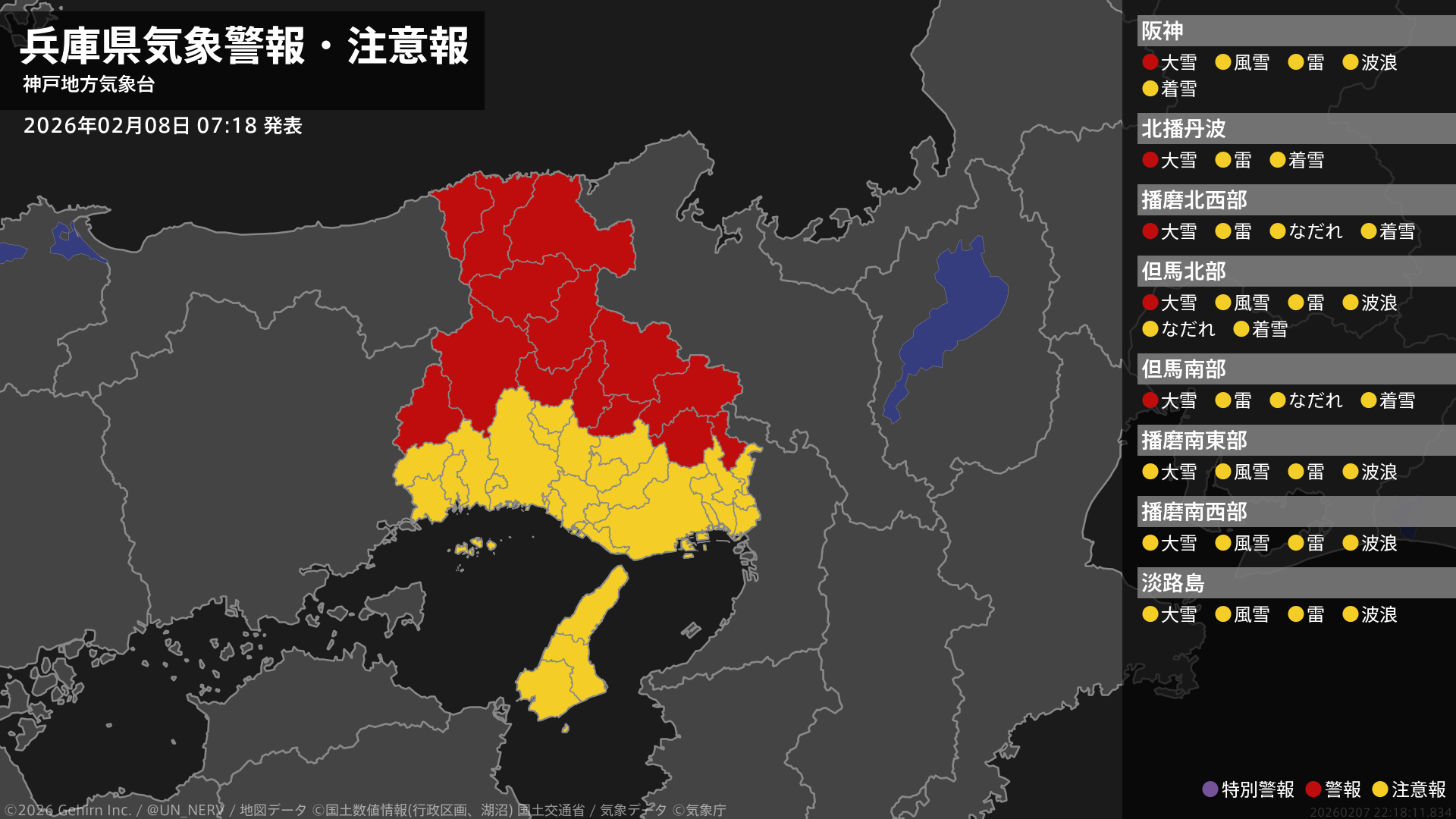 【兵庫県 気象警報・注意報 2026年02月08日 07:18】兵庫県では、8日夜のはじめ頃まで大雪に警戒してください。#気象警報注意報 #兵庫県