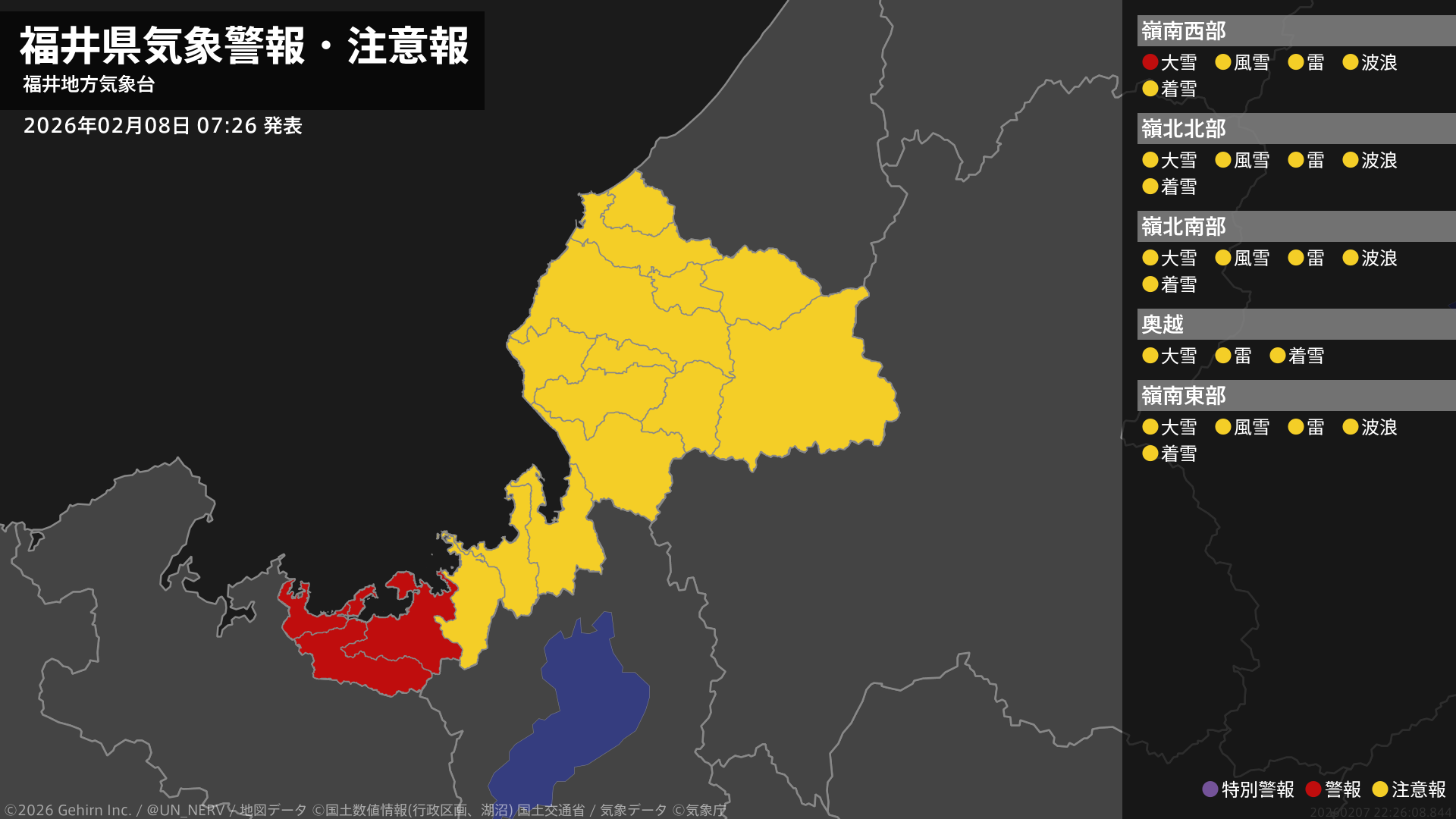 【福井県 気象警報・注意報 2026年02月08日 07:26】嶺南では、8日夕方まで大雪に警戒してください。#気象警報注意報 #福井県