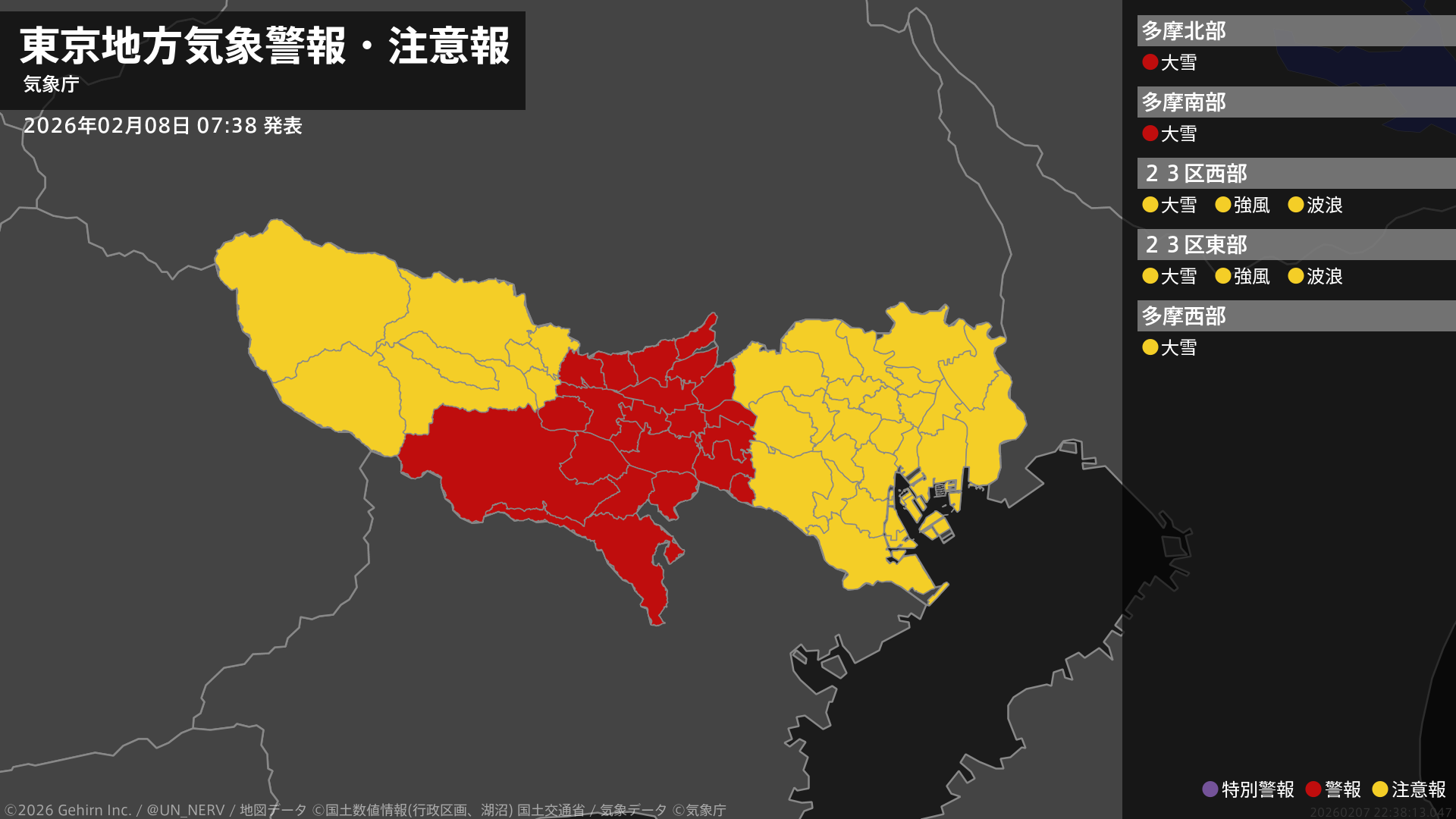 【東京都 気象警報・注意報 2026年02月08日 07:38】東京地方では、8日昼前まで大雪に警戒してください。伊豆諸島南部では、8日昼過ぎから9日明け方まで高波に警戒してください。#気象警報注意報 #東京都