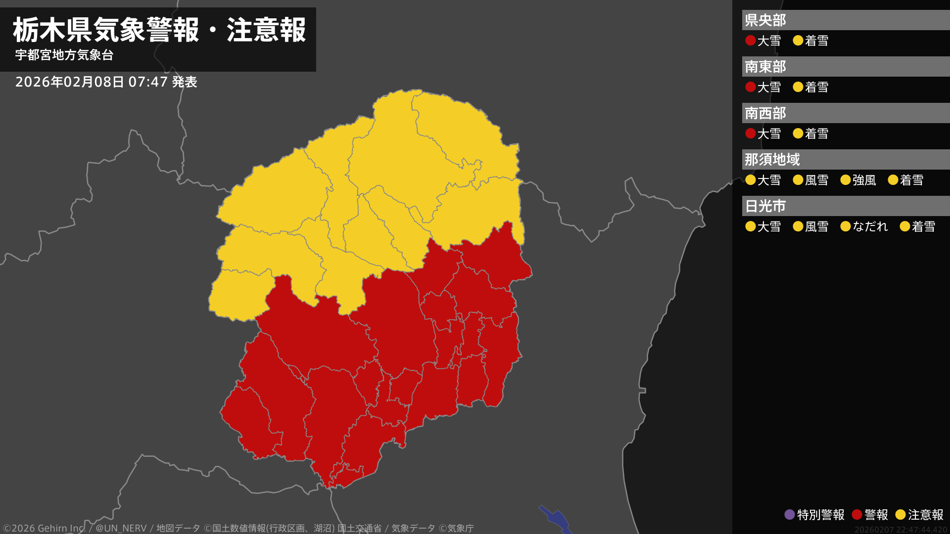 【栃木県 気象警報・注意報 2026年02月08日 07:47】南部では、8日昼前まで大雪に警戒してください。#気象警報注意報 #栃木県