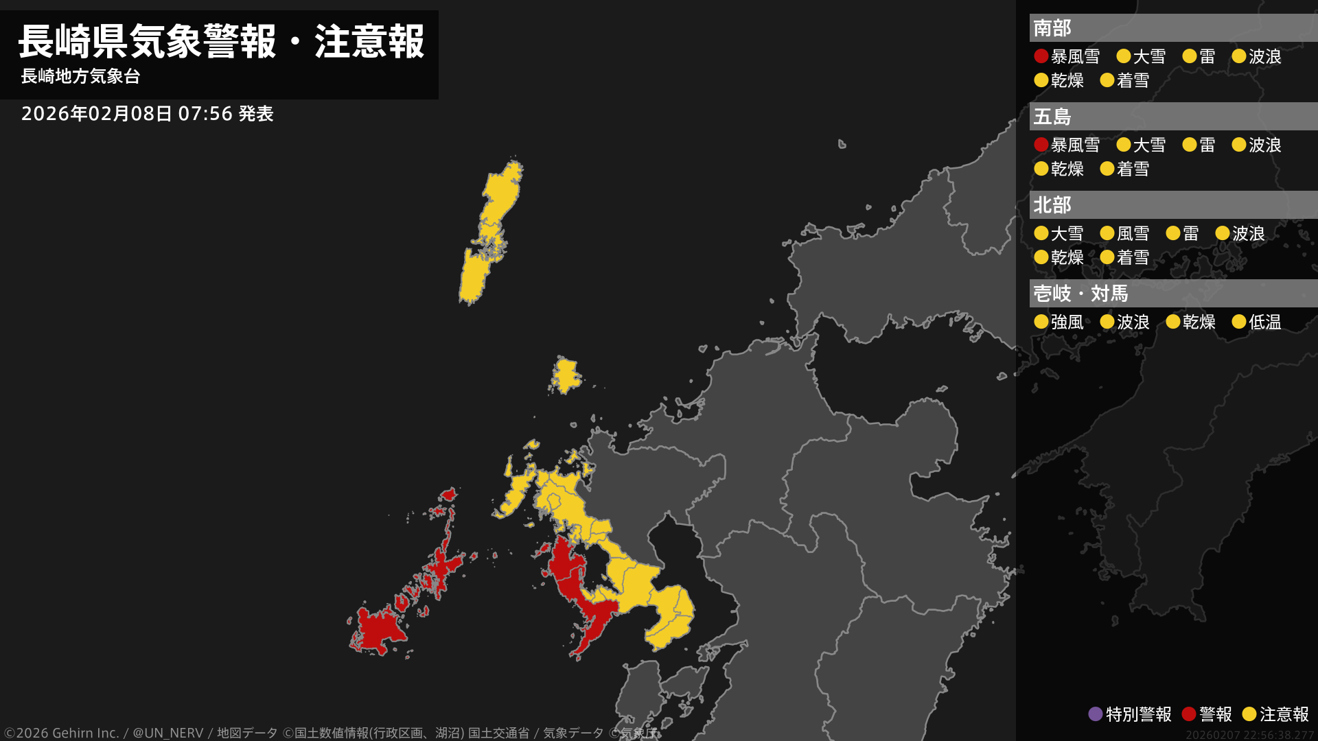 【長崎県 気象警報・注意報 2026年02月08日 07:56】南部、五島の海上では、8日夕方まで暴風雪に警戒してください。#気象警報注意報 #長崎県