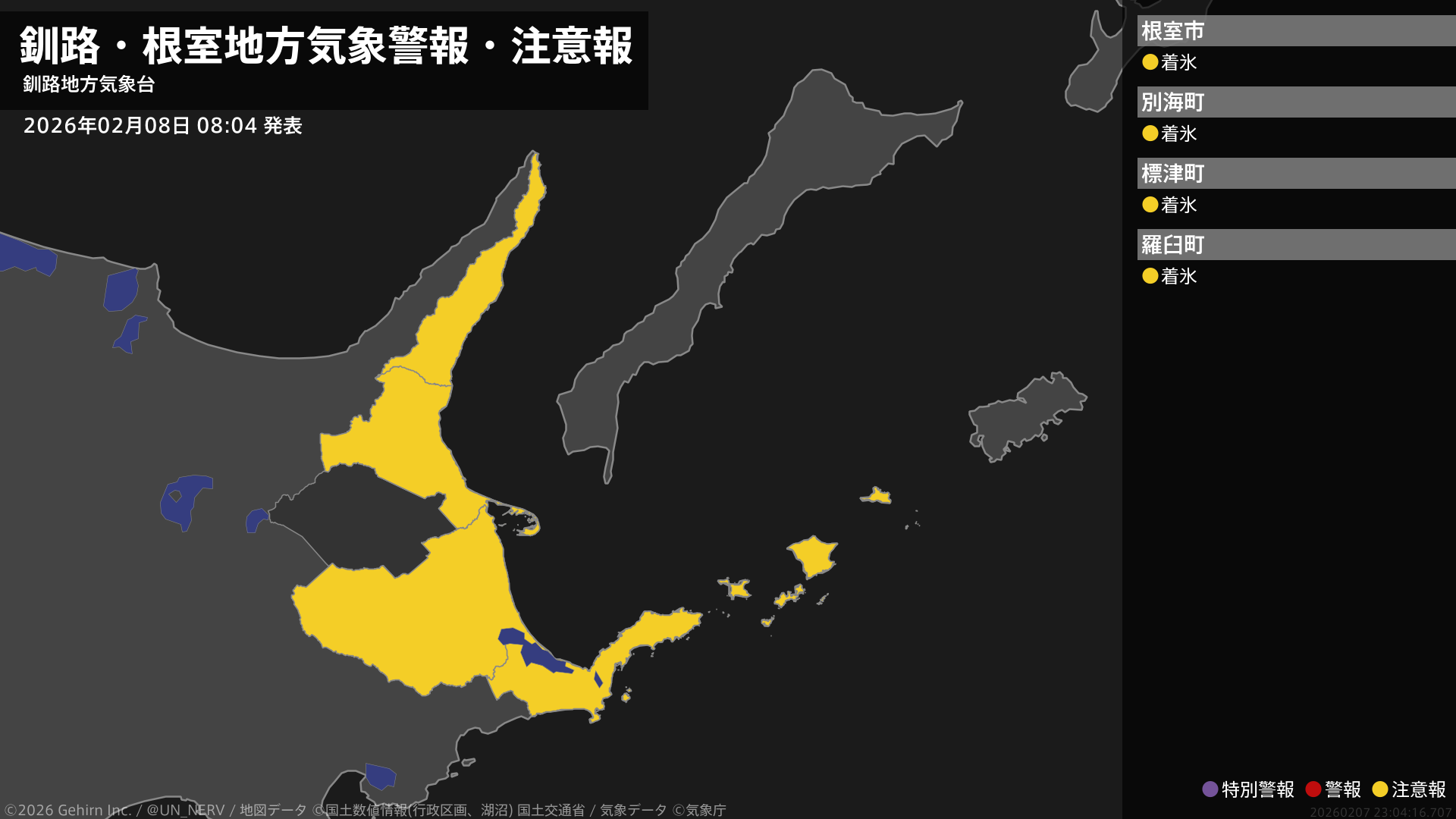 【釧路・根室地方 気象警報・注意報 2026年02月08日 08:04】根室地方では、8日昼前から着氷に注意してください。#気象警報注意報 #根室地方