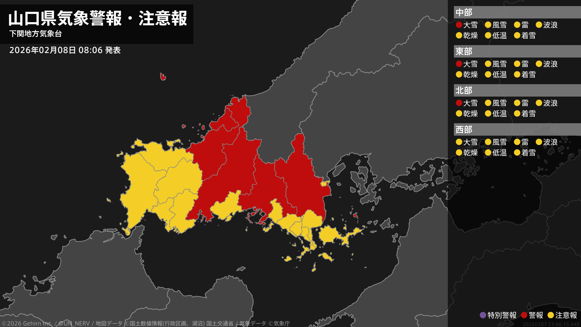 【山口県 気象警報・注意報 2026年02月08日 08:06】中部、東部、北部では、8日昼過ぎから8日夜のはじめ頃まで大雪に警戒してください。#気象警報注意報 #山口県