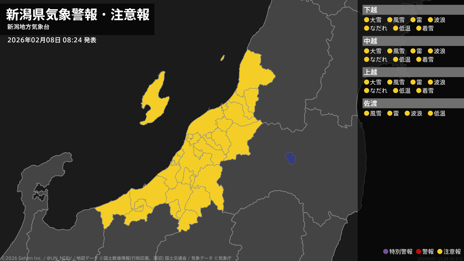 【新潟県 気象警報・注意報 2026年02月08日 08:24】新潟県では、風雪や高波、竜巻などの激しい突風、落雷、低温に注意してください。下越、中越、上越では、大雪やなだれ、電線等への着雪に注意してください。#気象警報注意報 #新潟県
