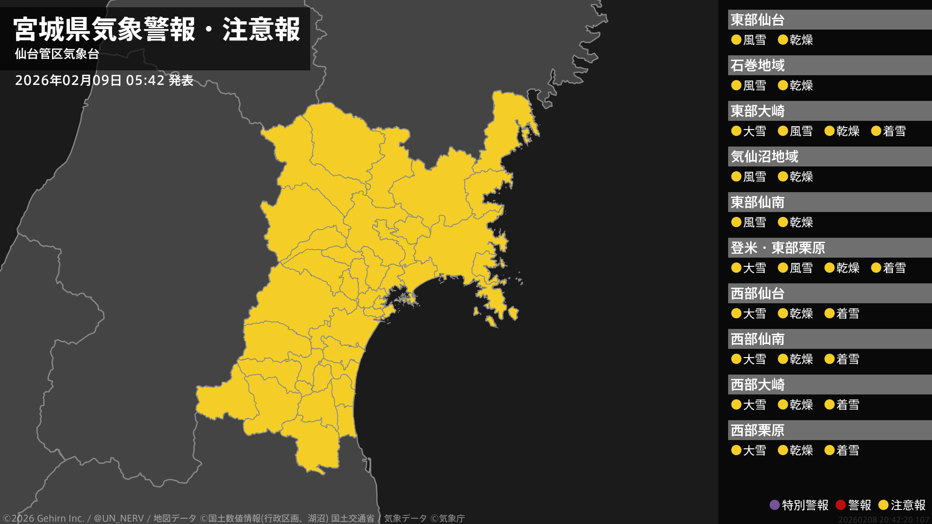 【宮城県 気象警報・注意報 2026年02月09日 05:42】東部では、9日夕方まで風雪に注意してください。宮城県では、9日昼前まで大雪や電線等への着雪に、10日まで空気の乾燥した状態が続くため、火の取り扱いに注意してください。#気象警報注意報 #宮城県
