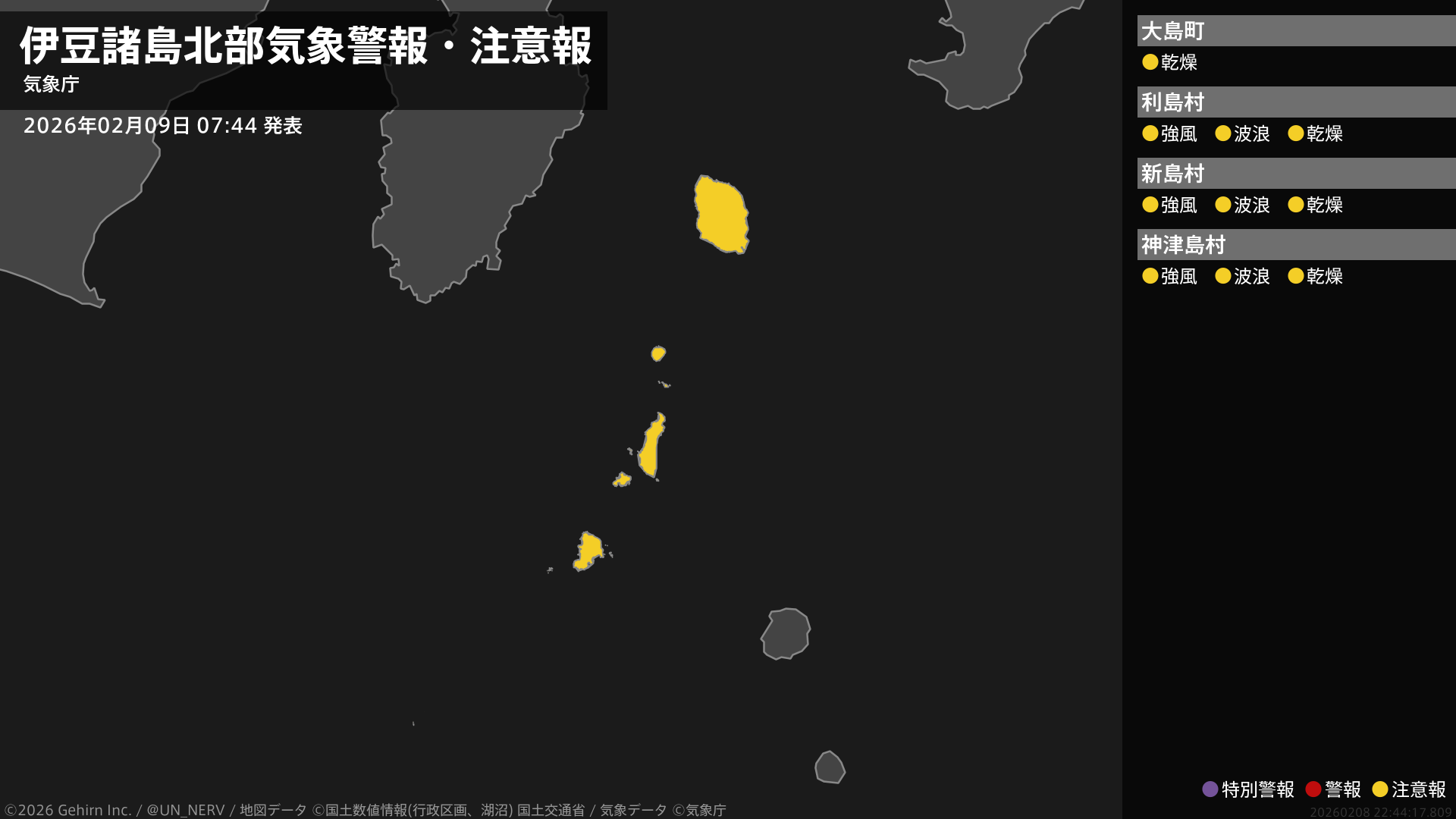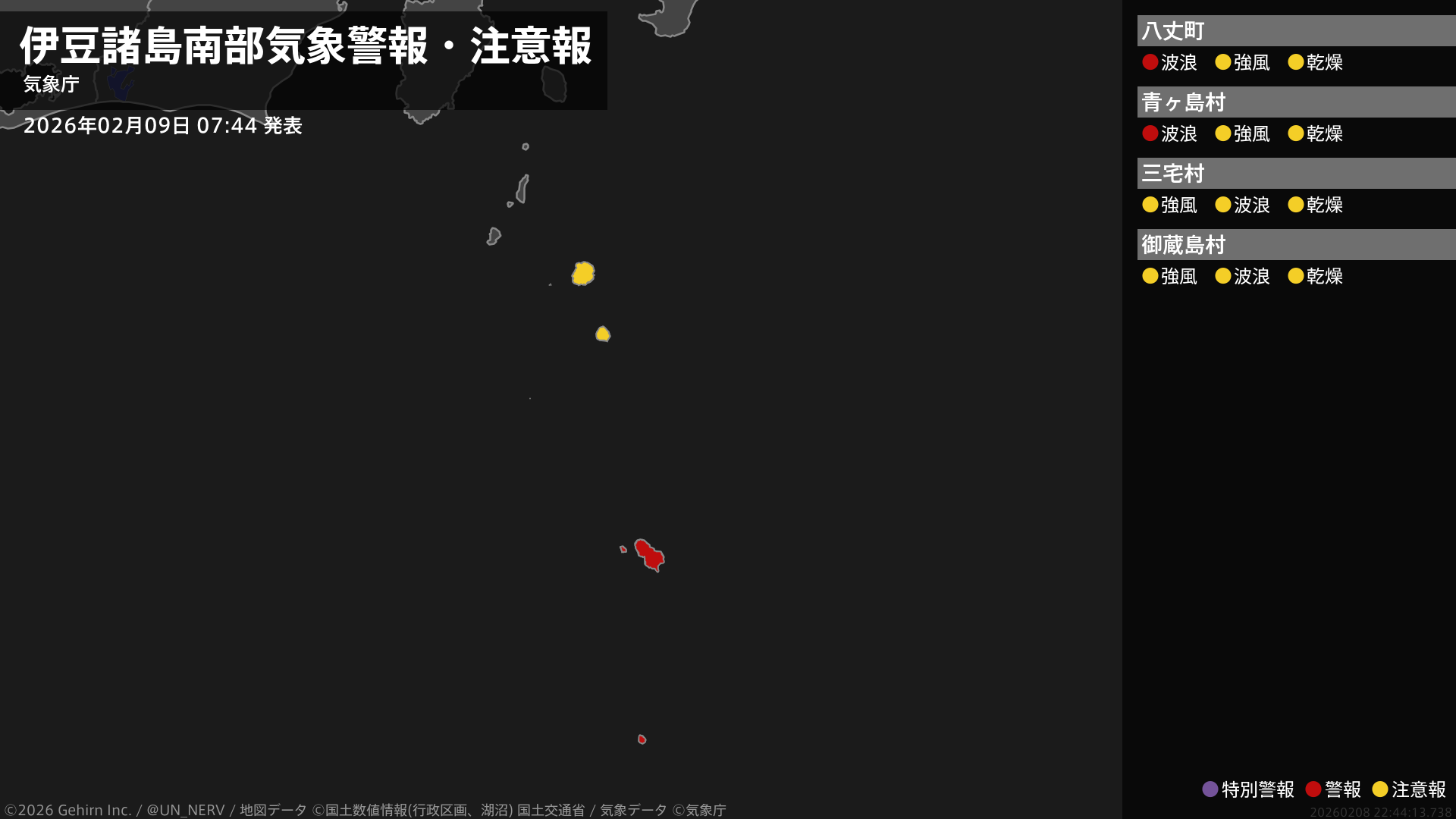 【東京都 気象警報・注意報 2026年02月09日 07:44】伊豆諸島南部では9日昼前まで、小笠原諸島では9日夕方まで、高波に警戒してください。#気象警報注意報 #東京都