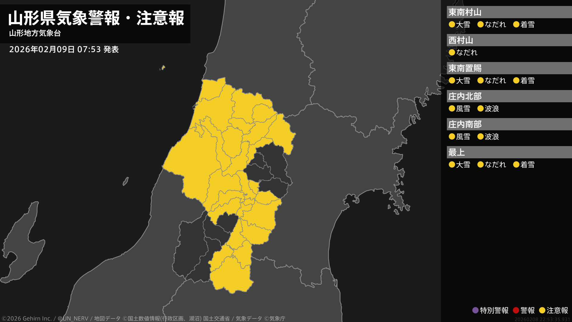 【山形県 気象警報・注意報 2026年02月09日 07:53】庄内では、9日夜遅くまで風雪に、10日朝まで高波に注意してください。村山、置賜、最上では、9日昼前まで大雪や電線等への着雪に、9日までなだれに注意してください。#気象警報注意報 #山形県