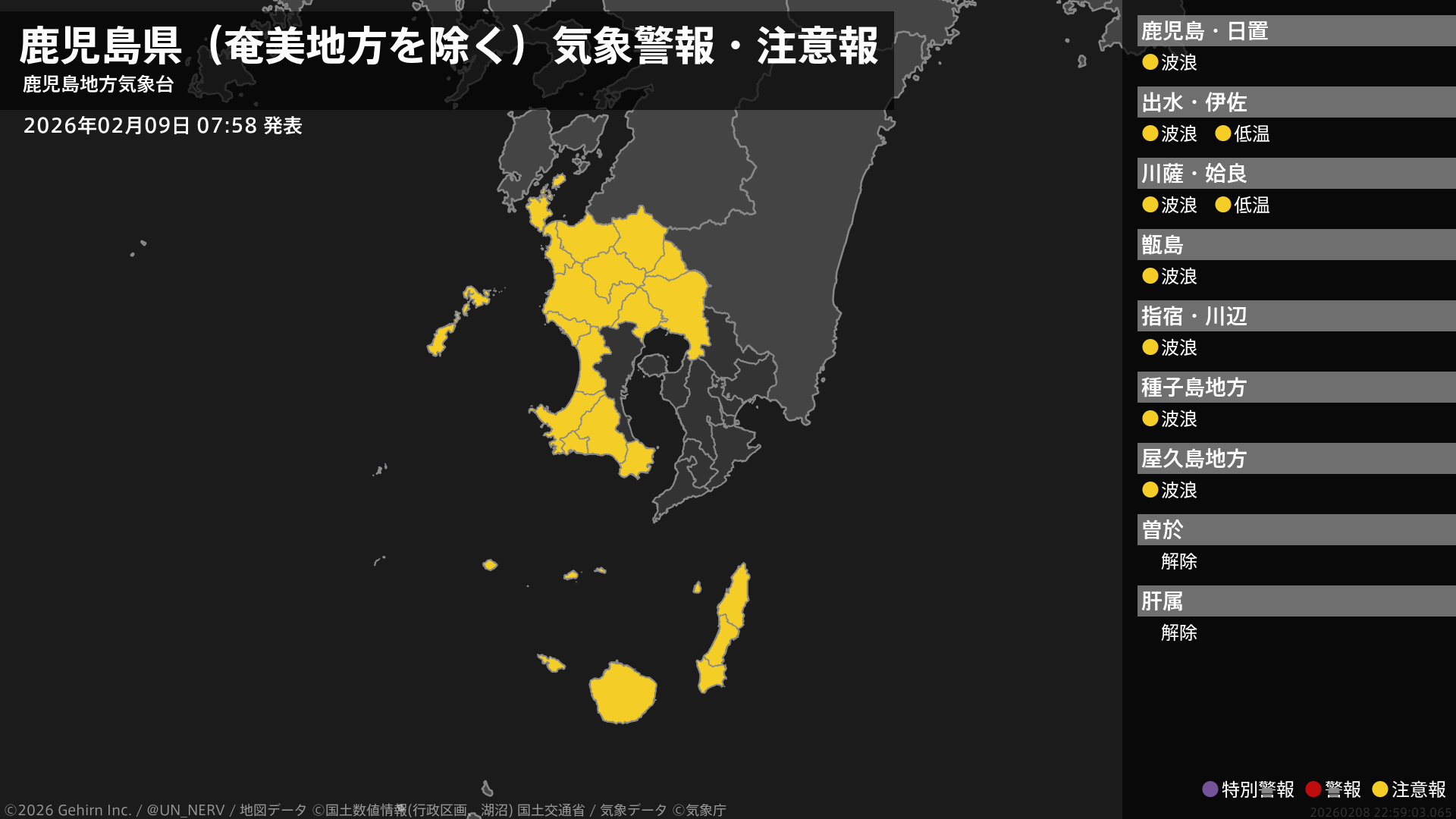 【鹿児島県(奄美地方を除く) 気象警報・注意報 2026年02月09日 07:59】薩摩、種子島・屋久島地方では、9日昼前まで高波に注意してください。薩摩地方では、9日まで低温に注意してください。#気象警報注意報 #鹿児島県(奄美地方除く)